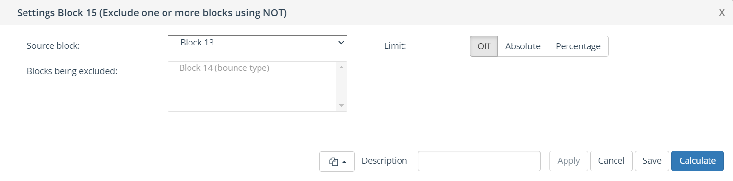 When using the 'NOT' block, you can specify in the settings (double-click on the block to open the settings) which block should be used as the source and which block(s) should be excluded.