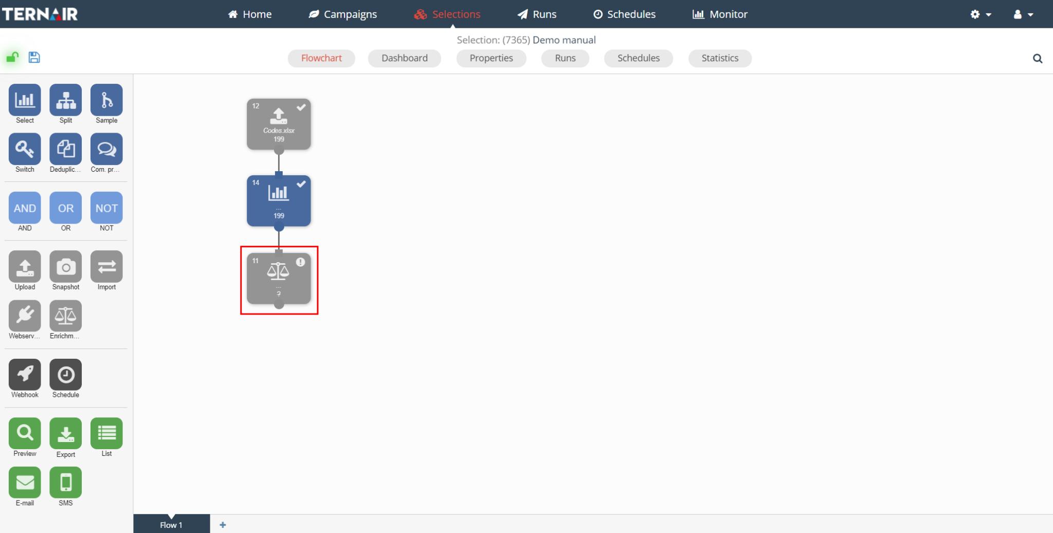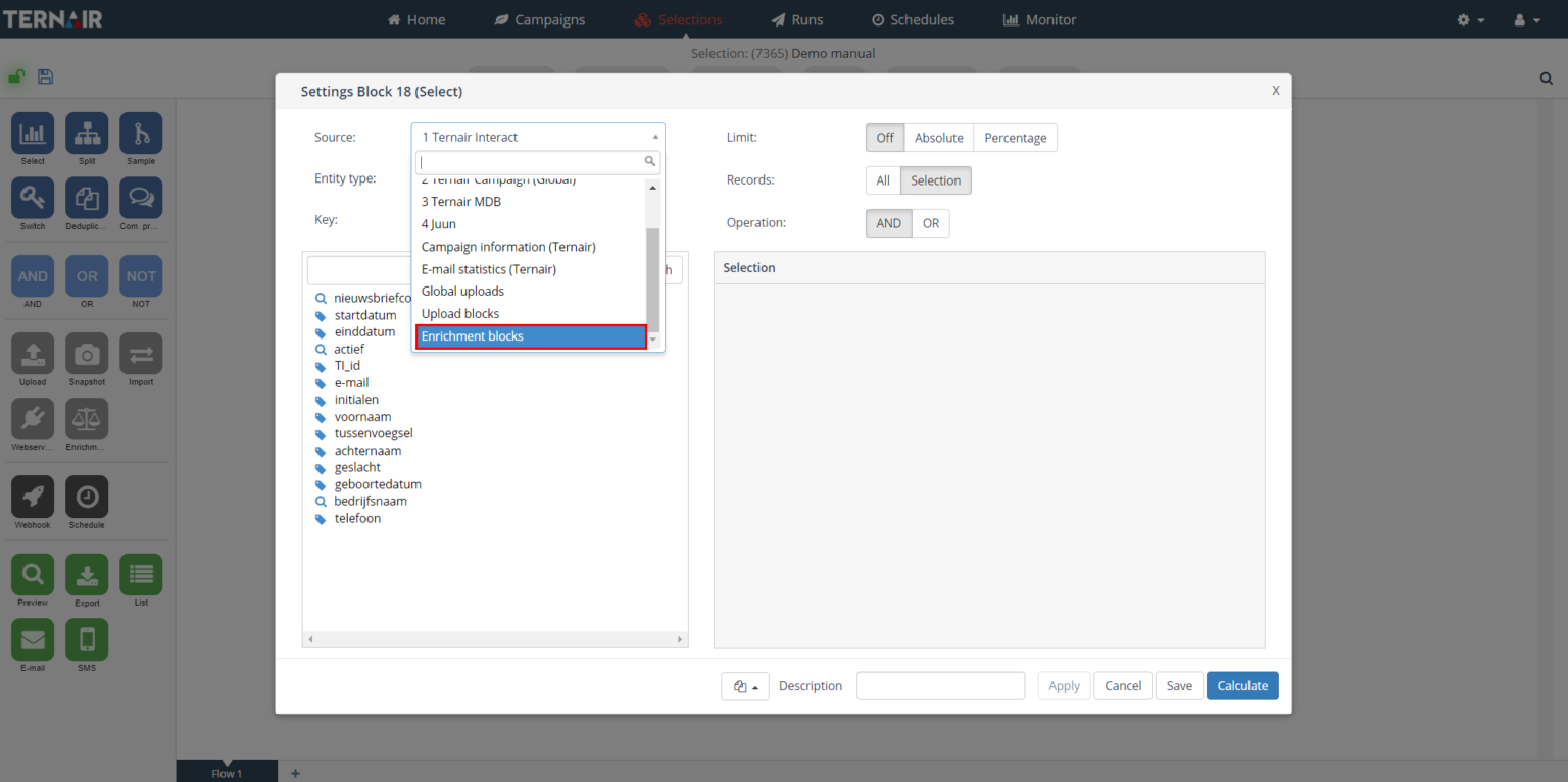 Creating an enrichment block will incorporate the enrichment data, as it is at the time of execution, into the database. The enrichment data can then be used as input for other blocks (in the same selection) at a later time.