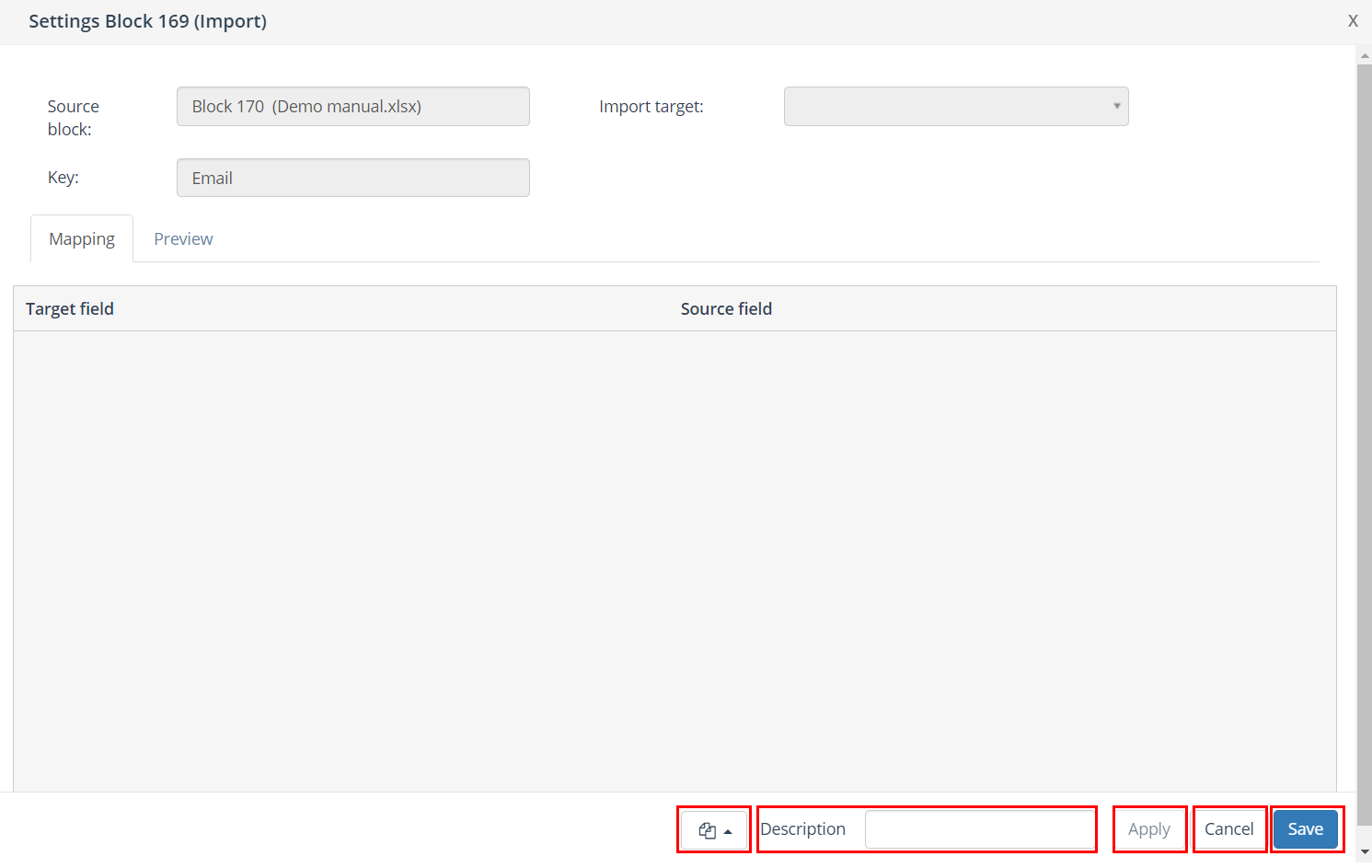 Block template | Every import block can be saved as a template. After an import block is saved as a template, it can be used as a template for other import blocks. A block template can be reused by clicking on 'Open block template' in the lower left corner of the import block and selecting the template from the list. |