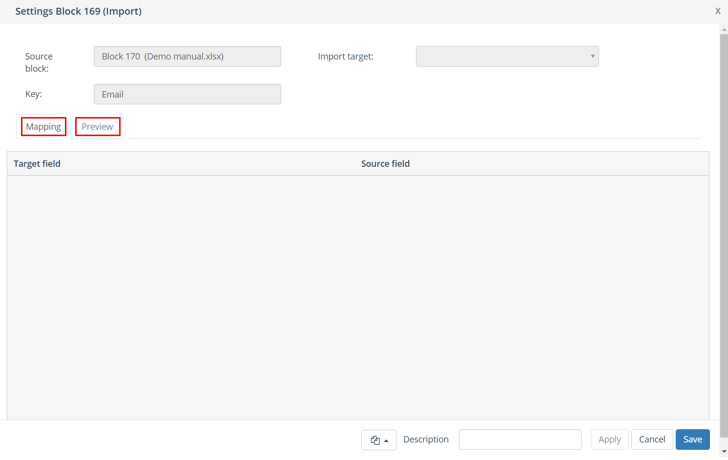 Mapping | Map the target field to a source field. Target fields marked with an asterisk (*) are required. |