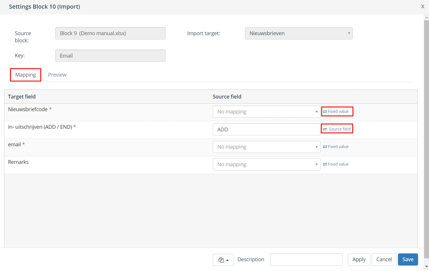Fixed values: enter a fixed value for all records in the import