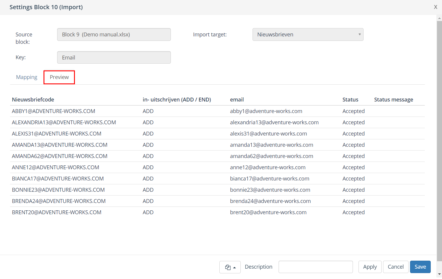 Description | You can specify a description for an import block. The description field is intended to specify a logical description for the block. This makes the contents of the output block easily recognizable in the selection flowchart. |