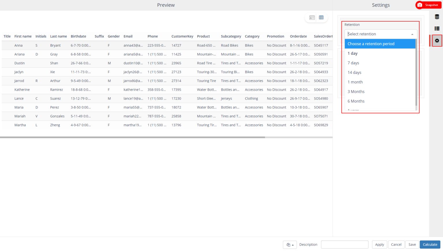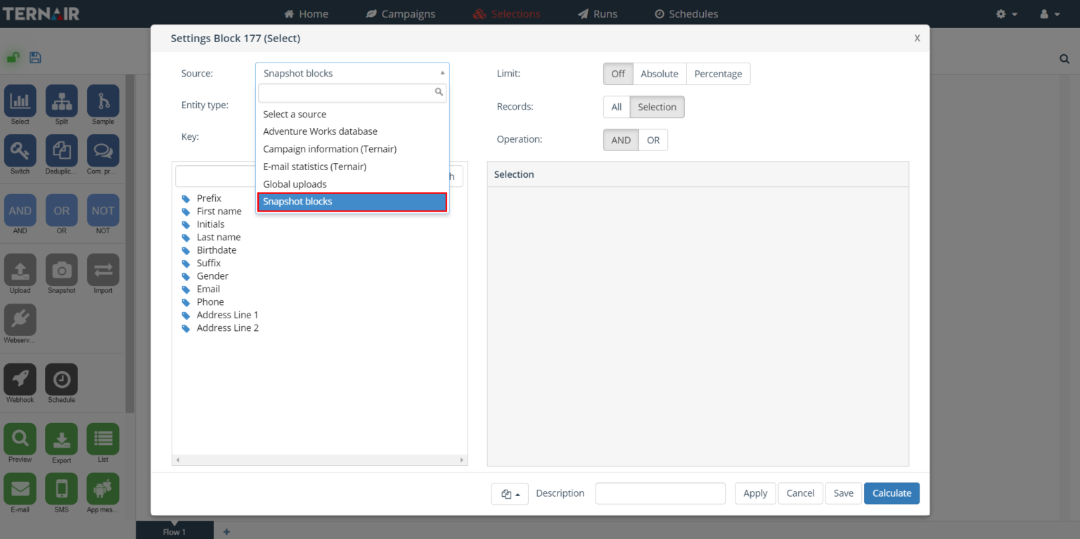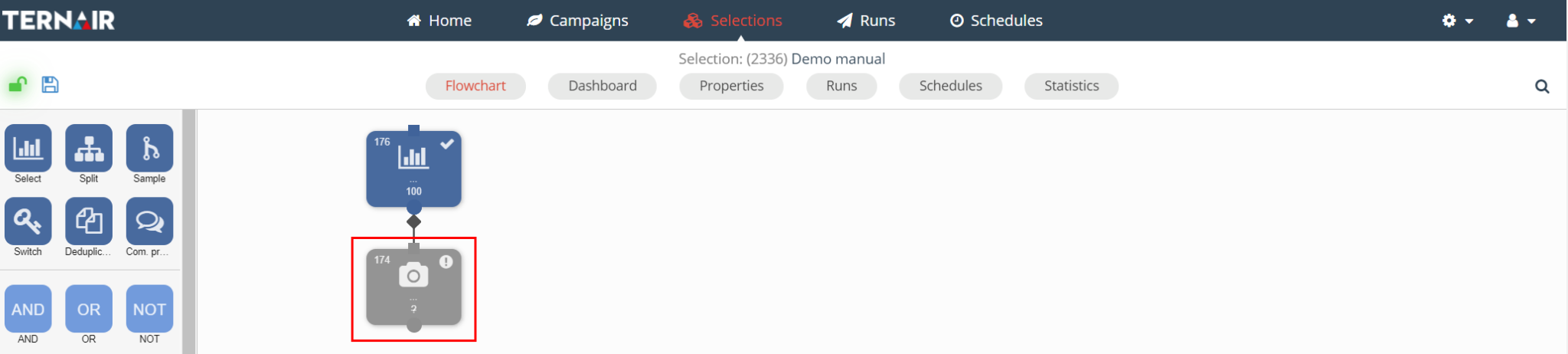 The Snapshot feature allows you to create internal tables in Ternair from which output details of a selection are recorded. The snapshot can then be used as an input to other selection or output blocks.