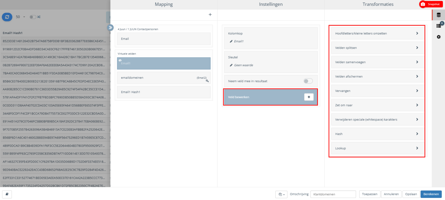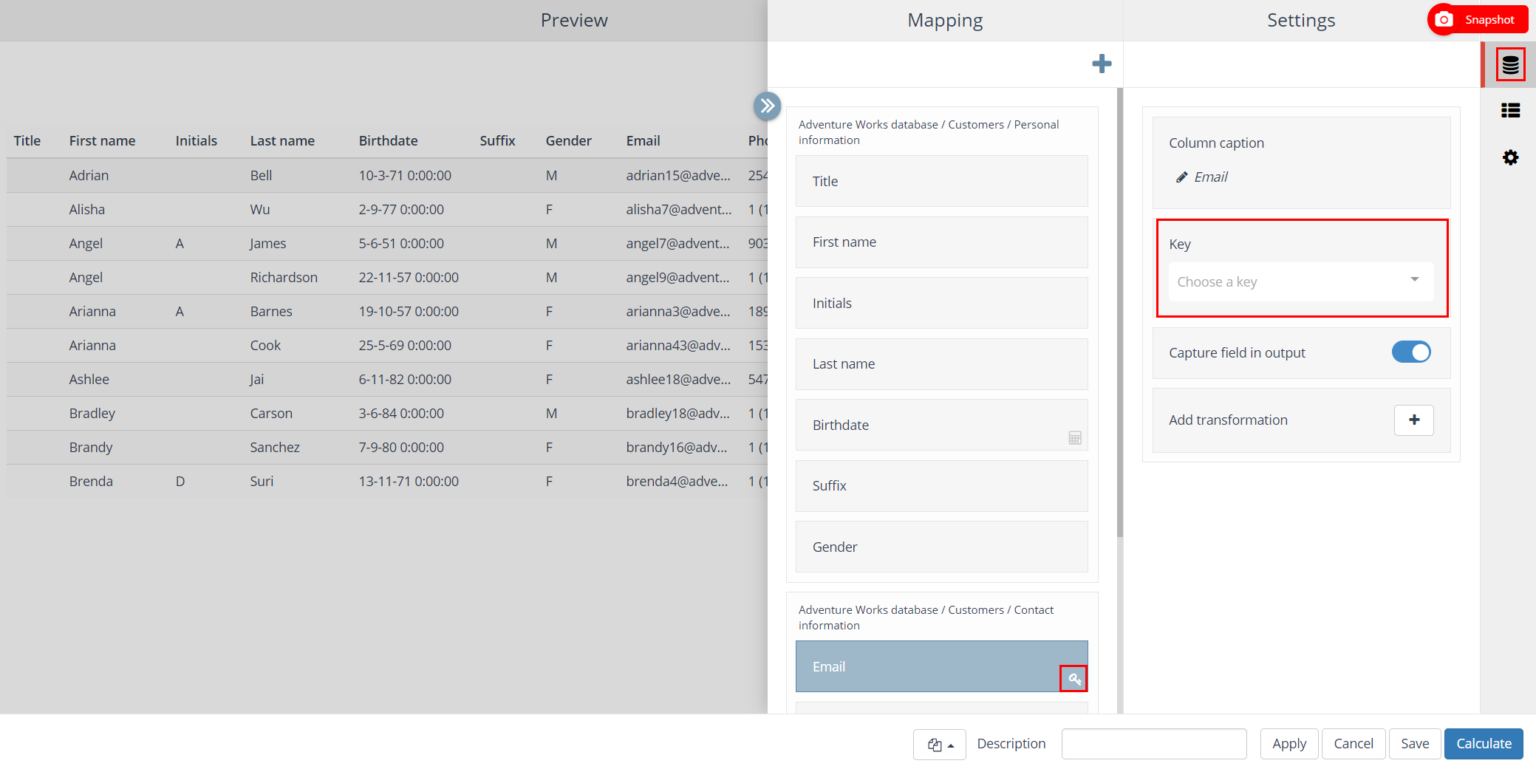 Example: select the key 'email' for the email address field. Assigning the key 'email' allows you to combine the snapshot with all other resources that also contain the key 'email'.