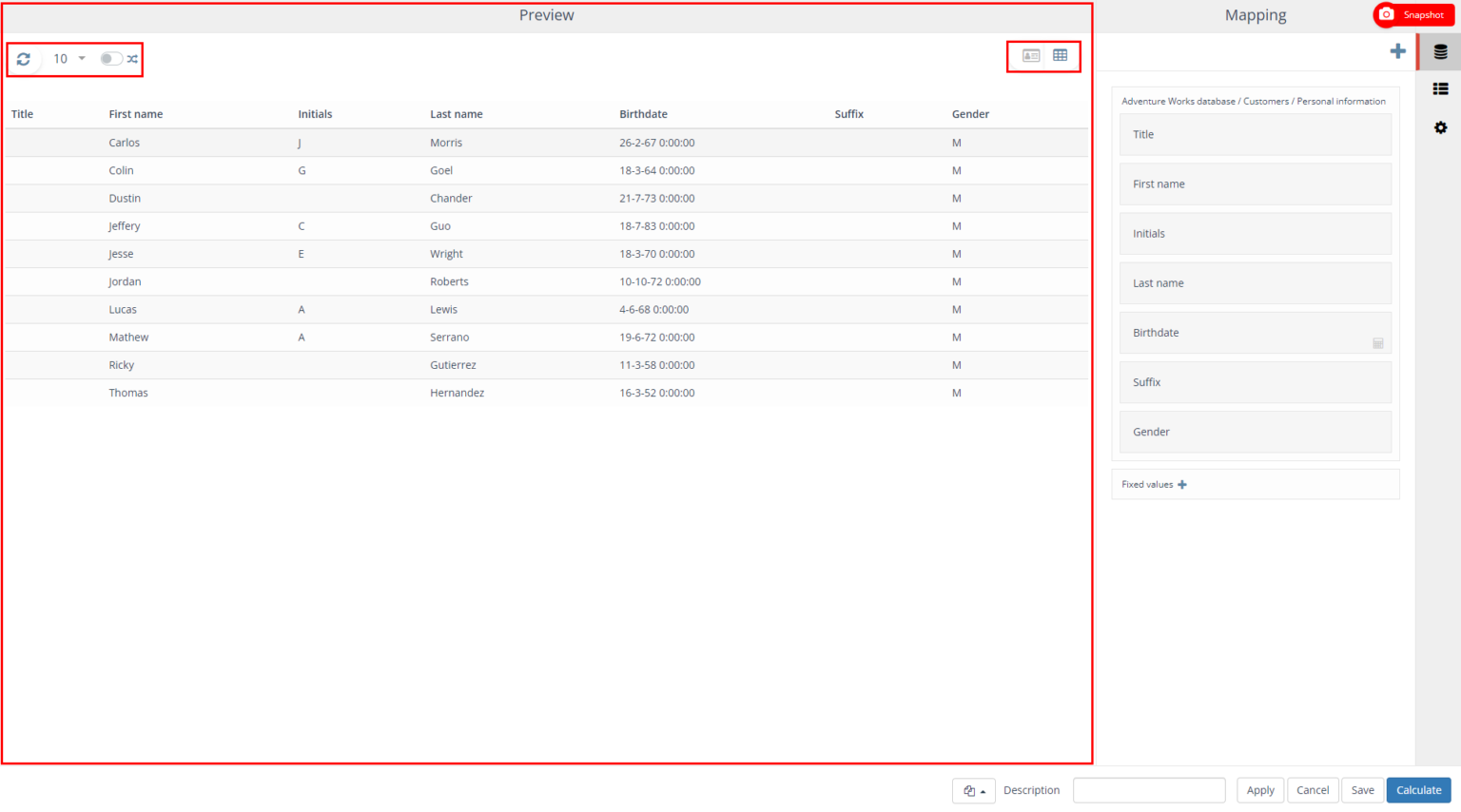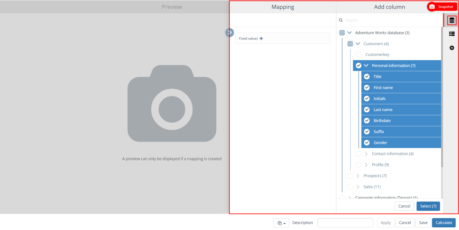 Creating a snapshot stores the values of selected fields, as they are at the time the block is executed, in the database. The snapshot can then be used at a later time as input for other blocks in the selection.