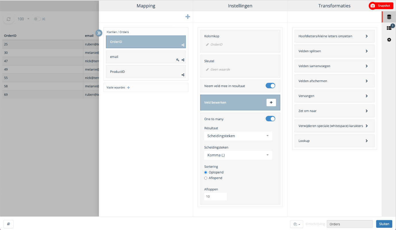 You can use this functionality, for example, to collect multiple orders from a customer. After all, a customer may have multiple orders. To see a customer's most recent orders, it is possible to choose descending 'Sort'. With the number under 'Capping' you specify the maximum number of records you want to see back.