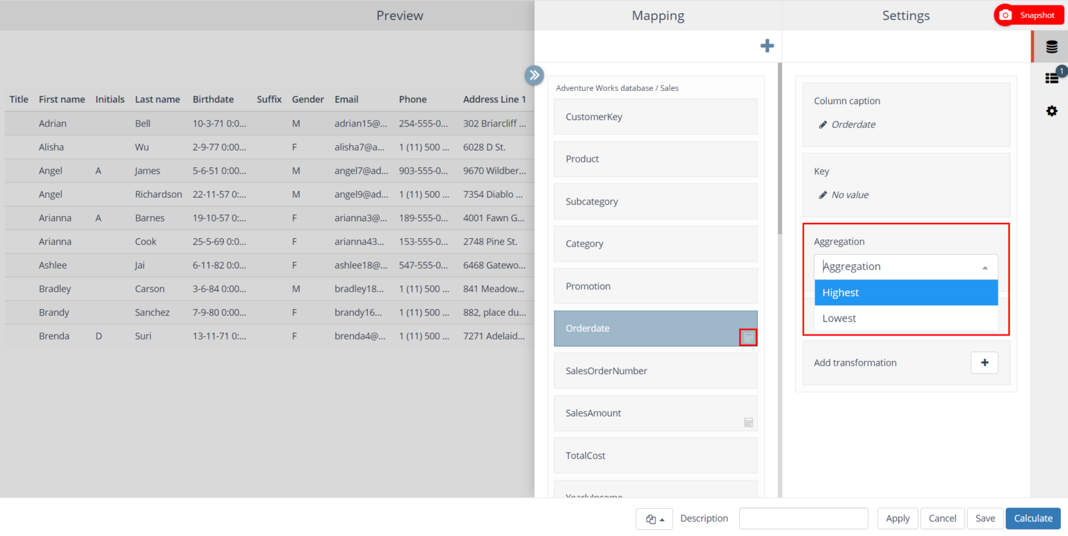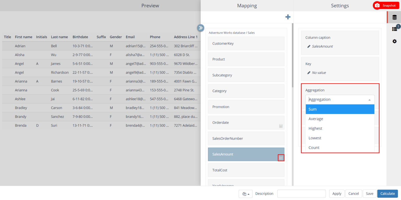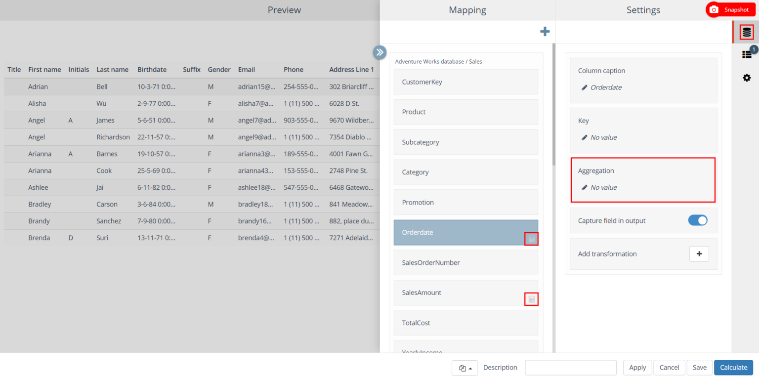 For numeric and date fields in snapshots, you can select aggregations. No aggregation is applied if it is not selected (default setting).