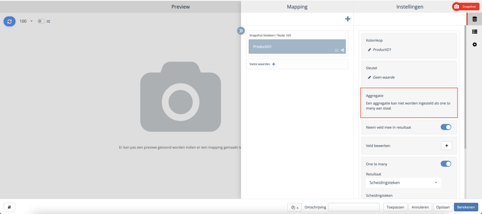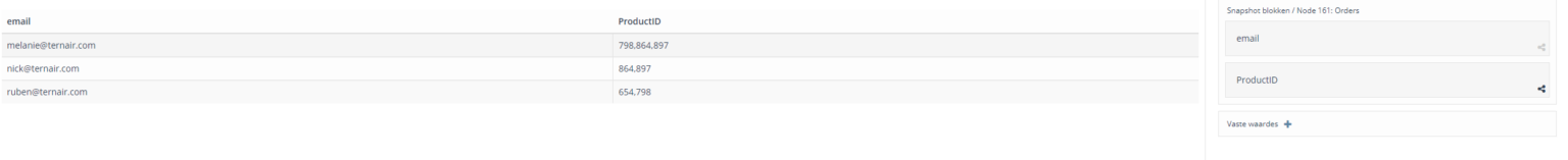 Within a Snapshot block, you can retrieve and snap data. This data is retrieved based on the selected key. It is possible that there are multiple values for one key. By default, you get the first found value. If this is not desirable, you can select the desired value(s) using the one-to-many functionality.