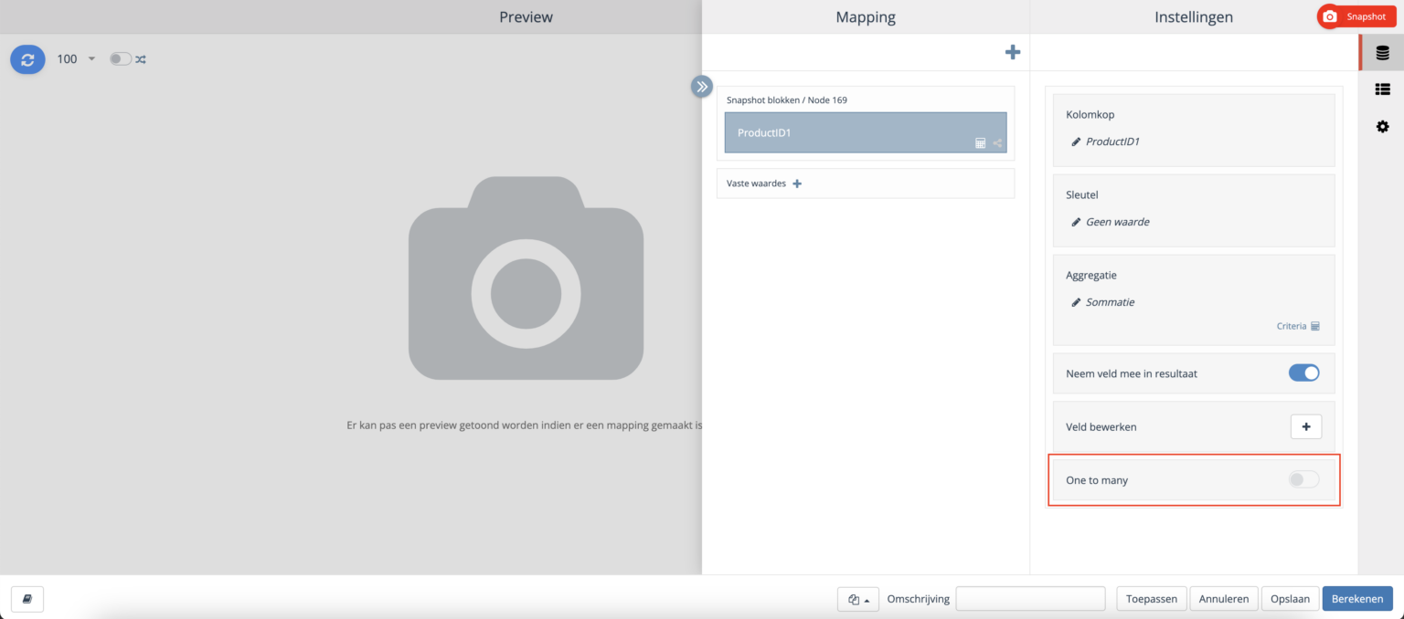 Please note:the one-to-many functionality can only be applied to a Snapshot block and can never be used in conjunction with aggregation.
