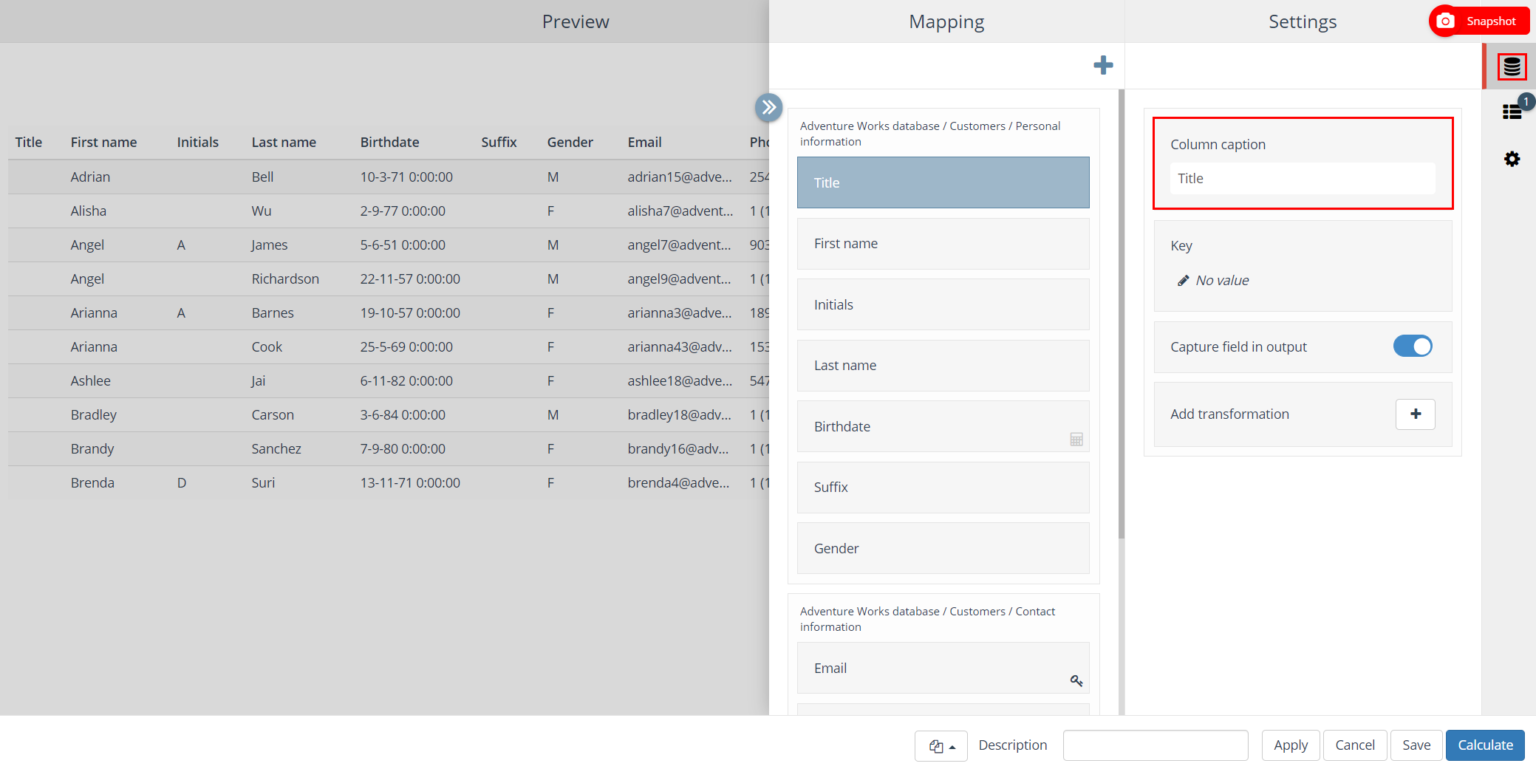 After adding an item, it is possible to customize the column header in the snapshot. The name of a column can be changed by clicking on the item.