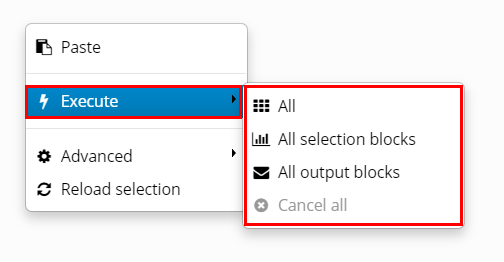 All output blocks: run all output blocks (selection blocks are not recalculated).
