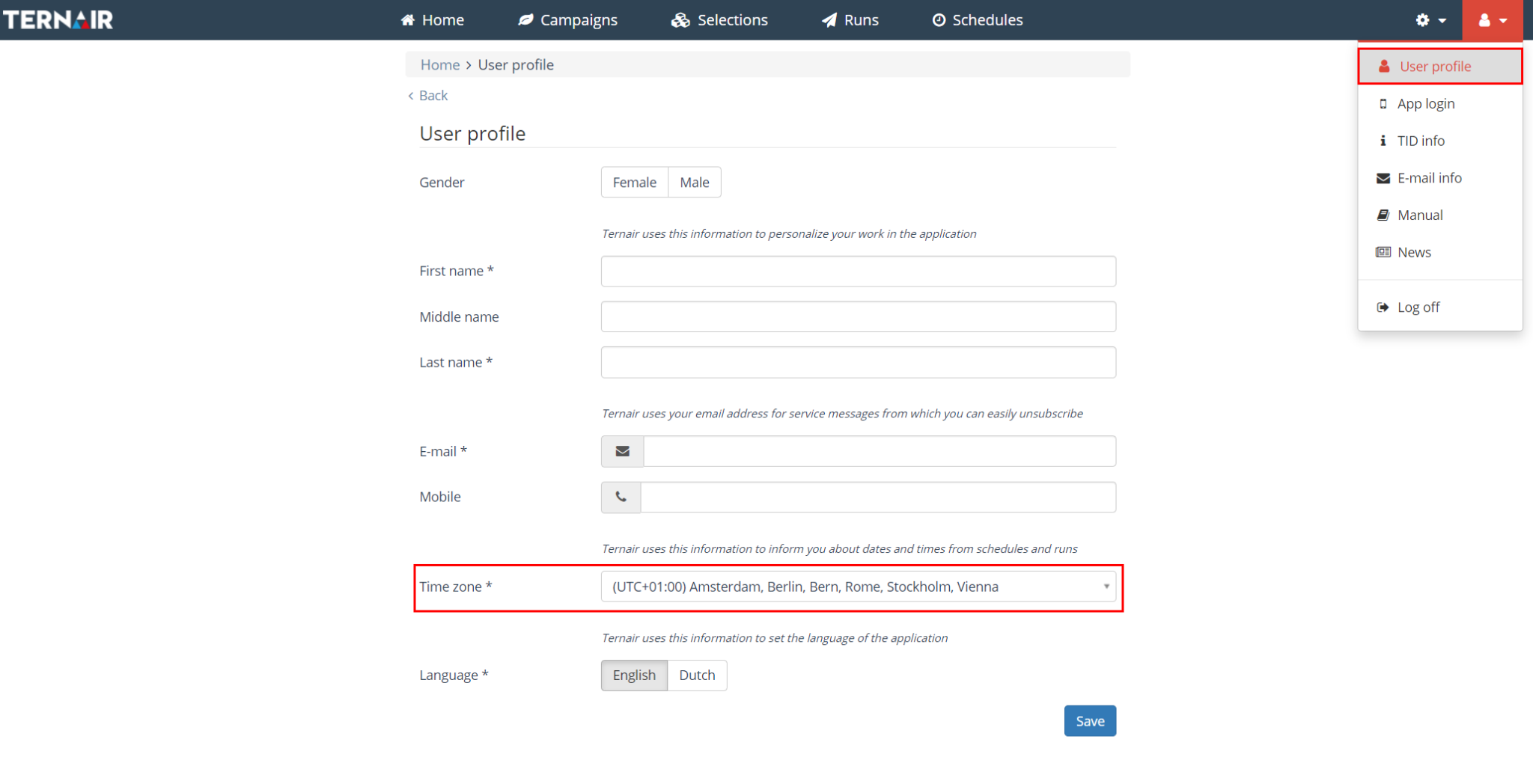 The time zone can be set in the user profile. The default time zone is Amsterdam, Berlin, Bern, Rome, Stockholm, Vienna (UTC+01:00).