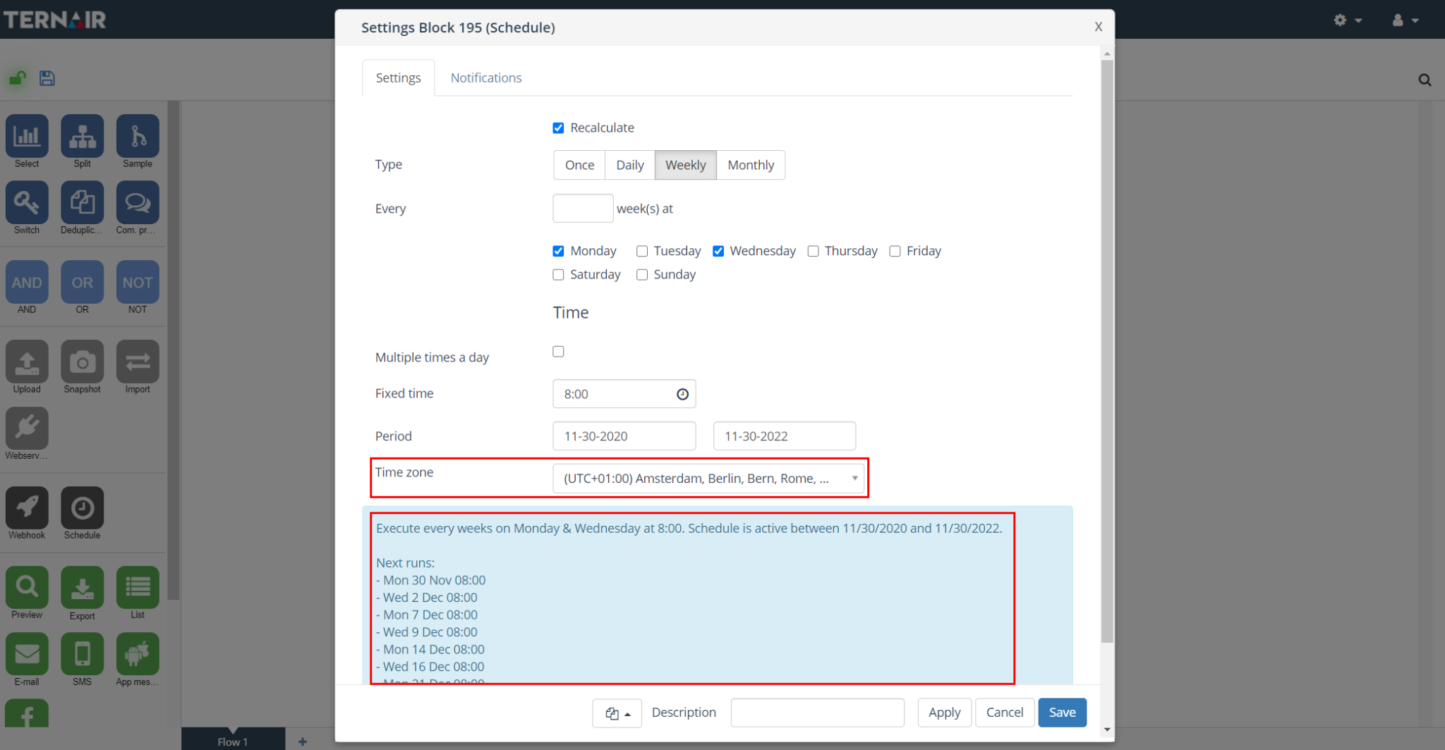 Select a time zone in the schedule settings to perform a selection in that time zone. After performing the necessary settings, a summary of the schedule is displayed at the bottom of the block. This summary also lists the upcoming runs for this schedule (up to 10).