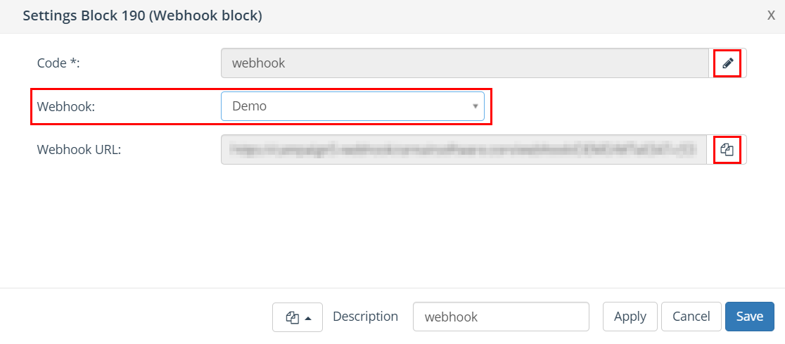 Please note that in order to use a webhook block, a configuration in the general settings is required.