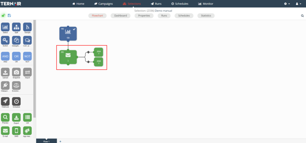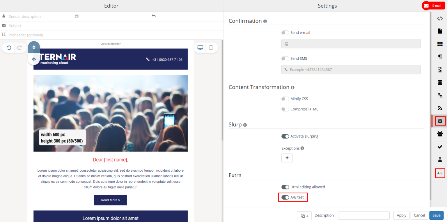 With the output option 'A/B testing', an A/B test can be created and run automatically in Ternair Campaign.