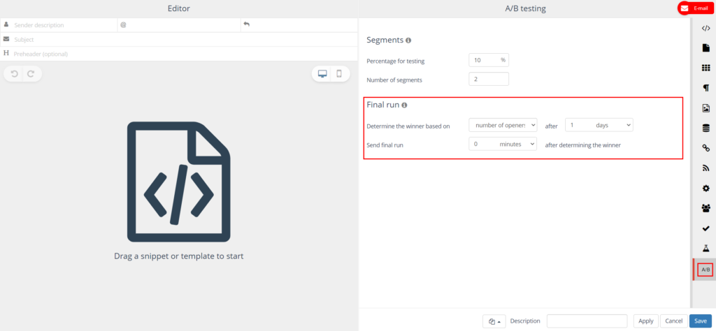 Please note: After saving the email block, the content and settings of the block cannot be changed. In the A/B test blocks, the content for the different test segments can be created and modified.