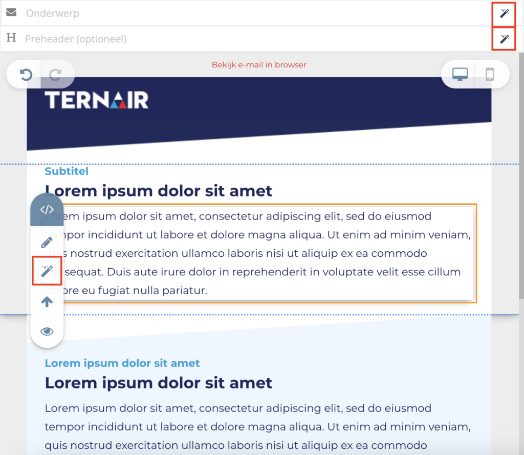 You can use the AI assistant for both the subject, preheader and body of the email. Open an email block and click on the magic wand of the item you want the AI Assistant to generate.