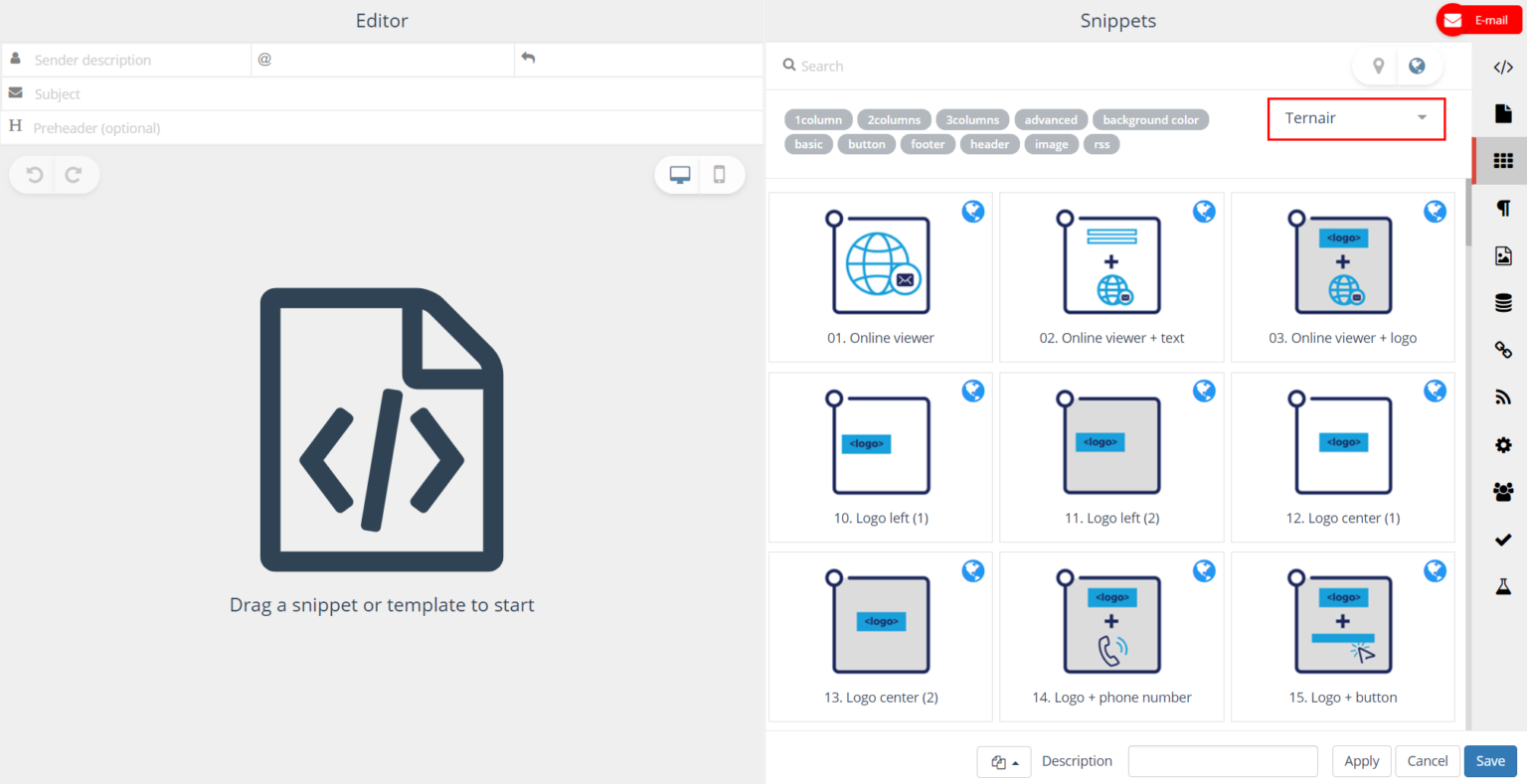 For option three, drag one or more snippets from the snippets tab to the left side of the email block to build an email with snippets.