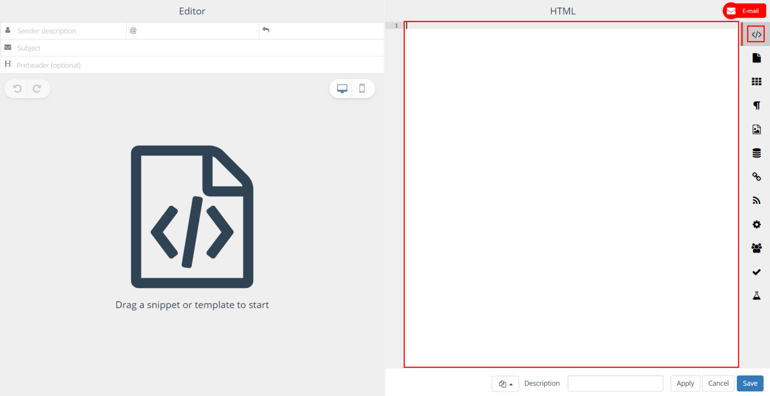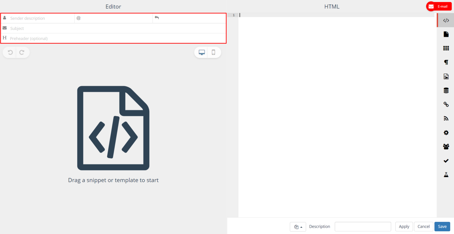 For creating the email content, there are several options; (1) use your own HTML, (2) use an existing template or (3) create your own email with snippets.
