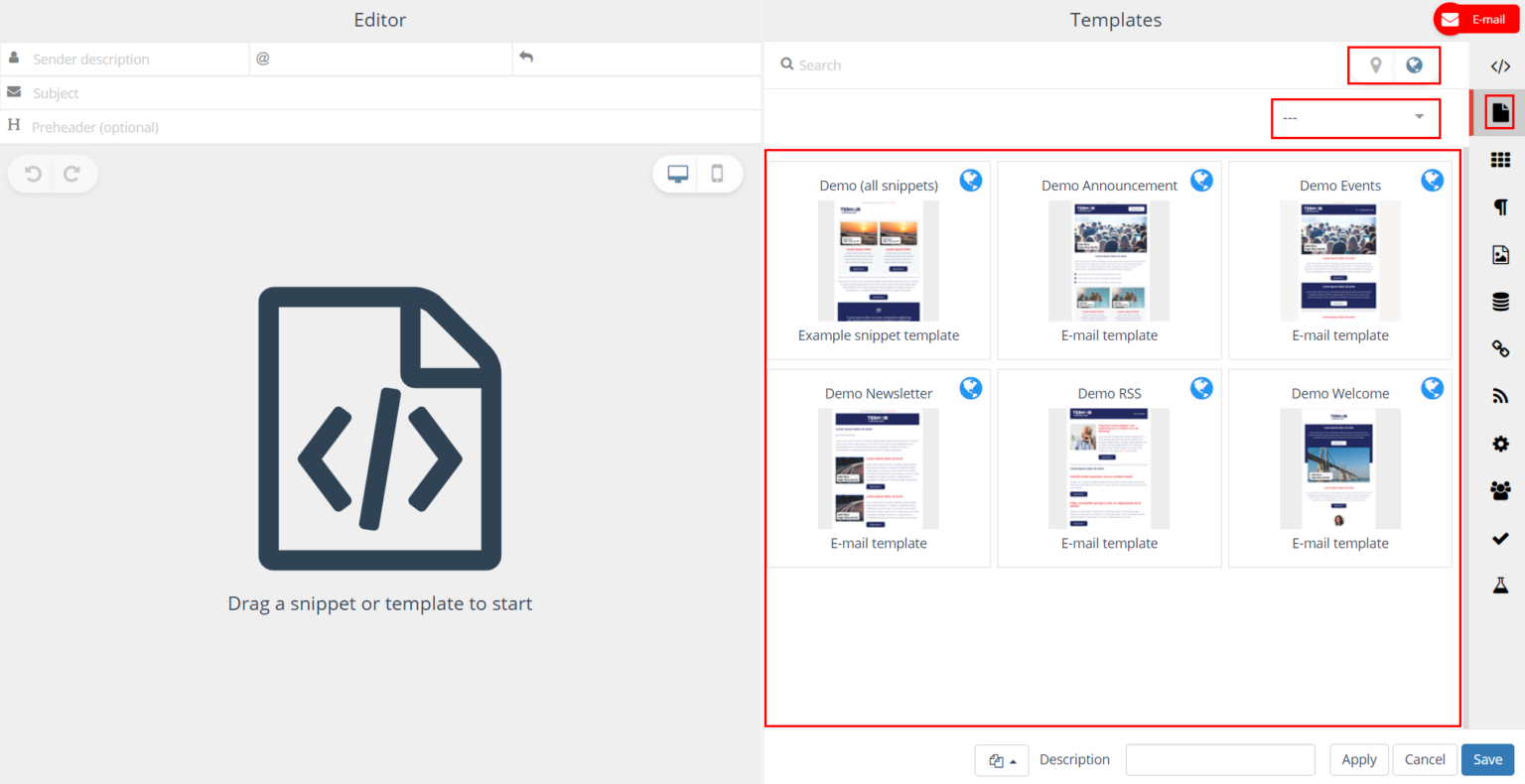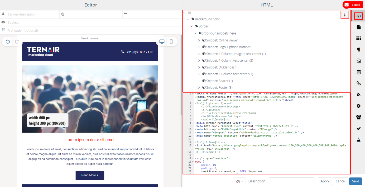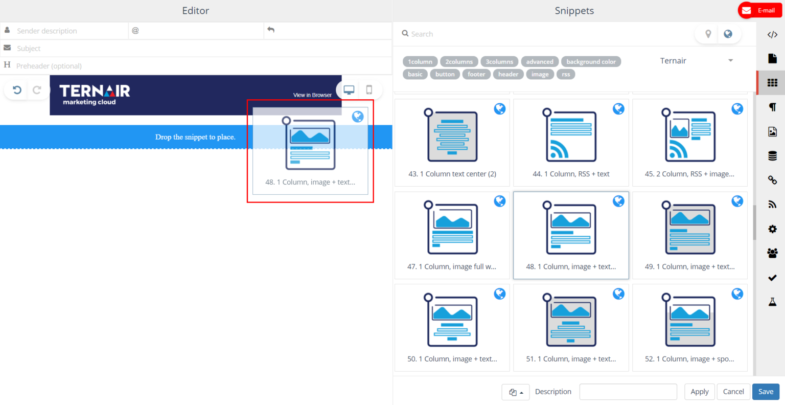 When a template is created or selected, the email can be edited (on the left side of the screen). In the document overview view (on the right side) it is possible to select the email snippet.