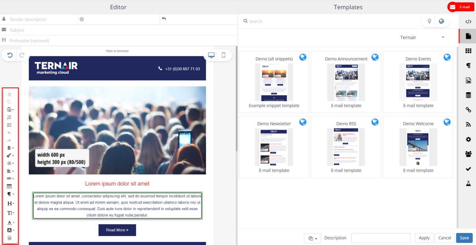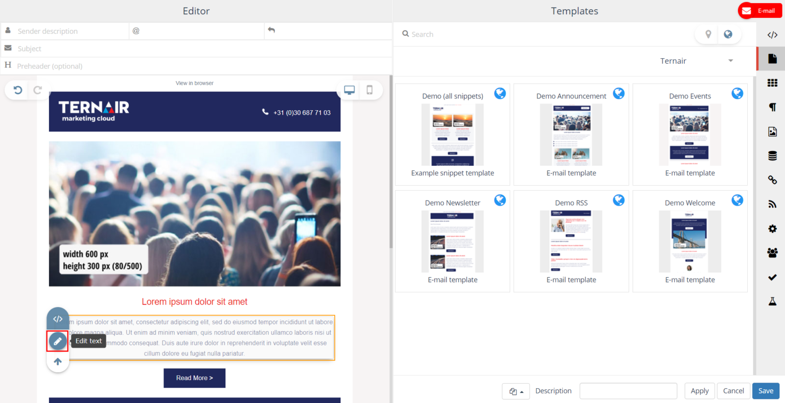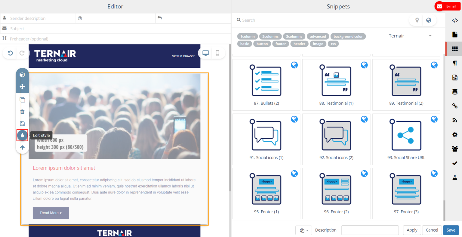 Select and edit (rotate/mirror) image TIP: an image can be dragged into content from the Images tab (if ternair-img is used) | |