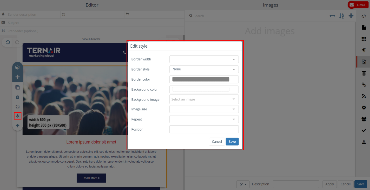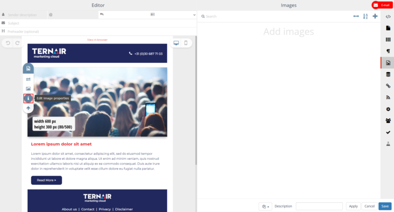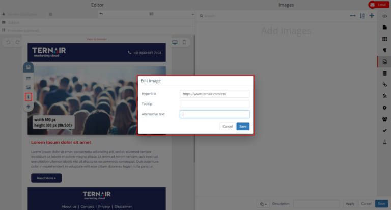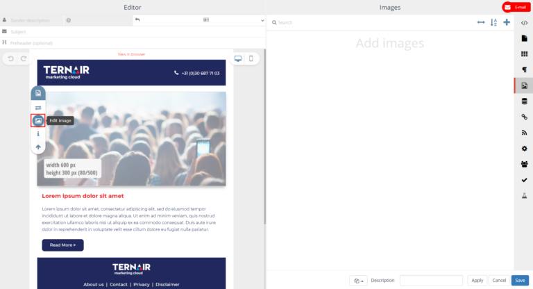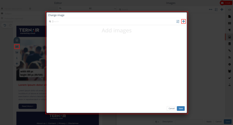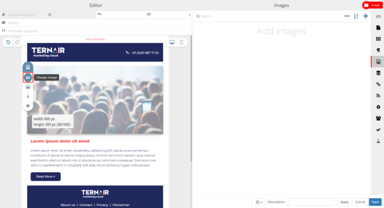 Images added on the Images tab (via the + icon) can be used in the content of the email block in which they were added.