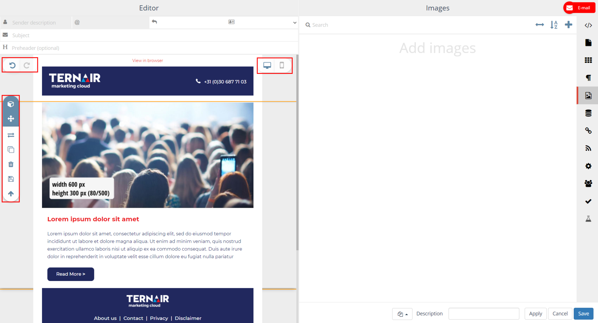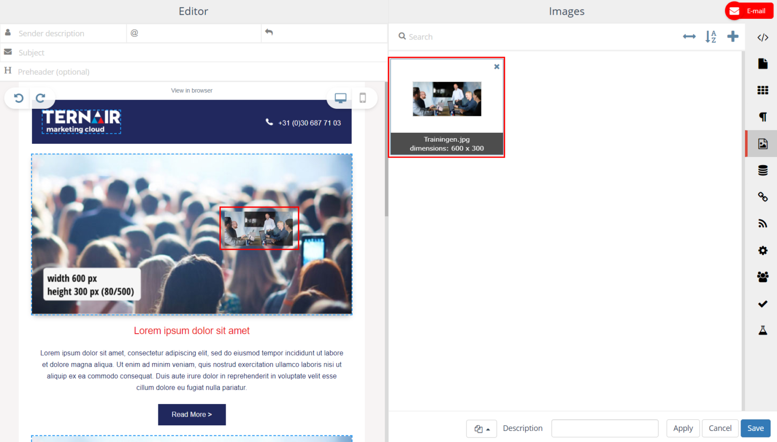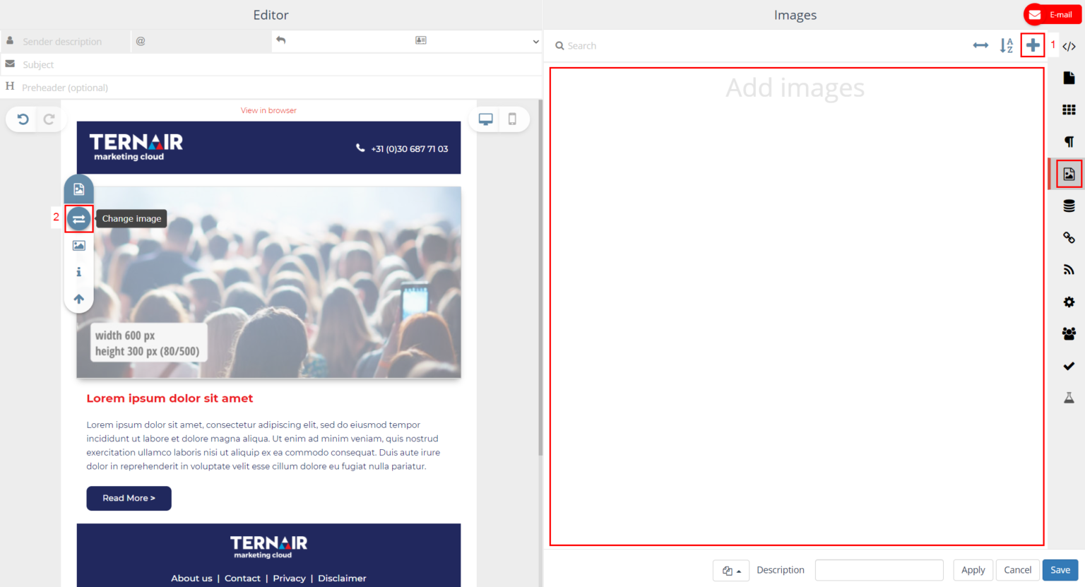 Images added on the Images tab (via the + icon) can be used in the content of the email block in which they were added.