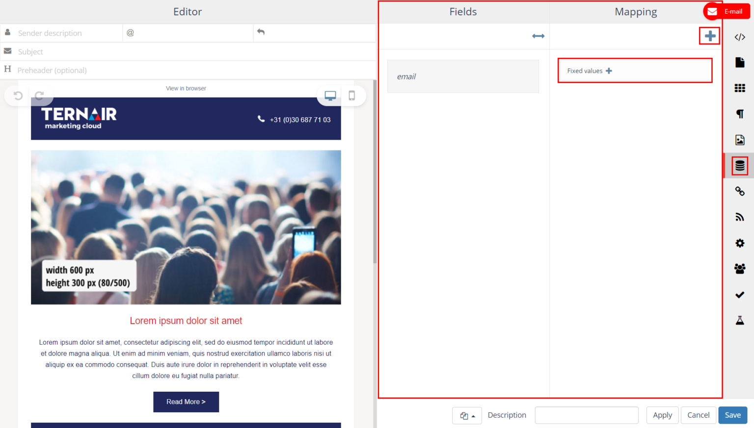 Fields in the left column, Fields, are automatically added to the content of an email when parentheses are placed around a field in the content, for example [first name].