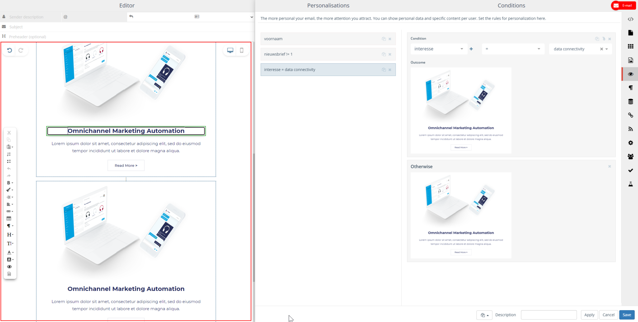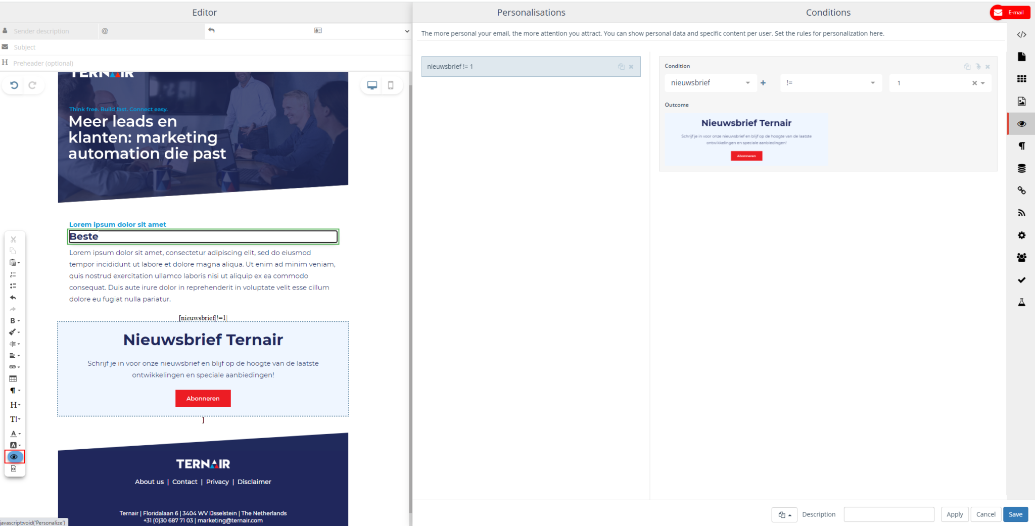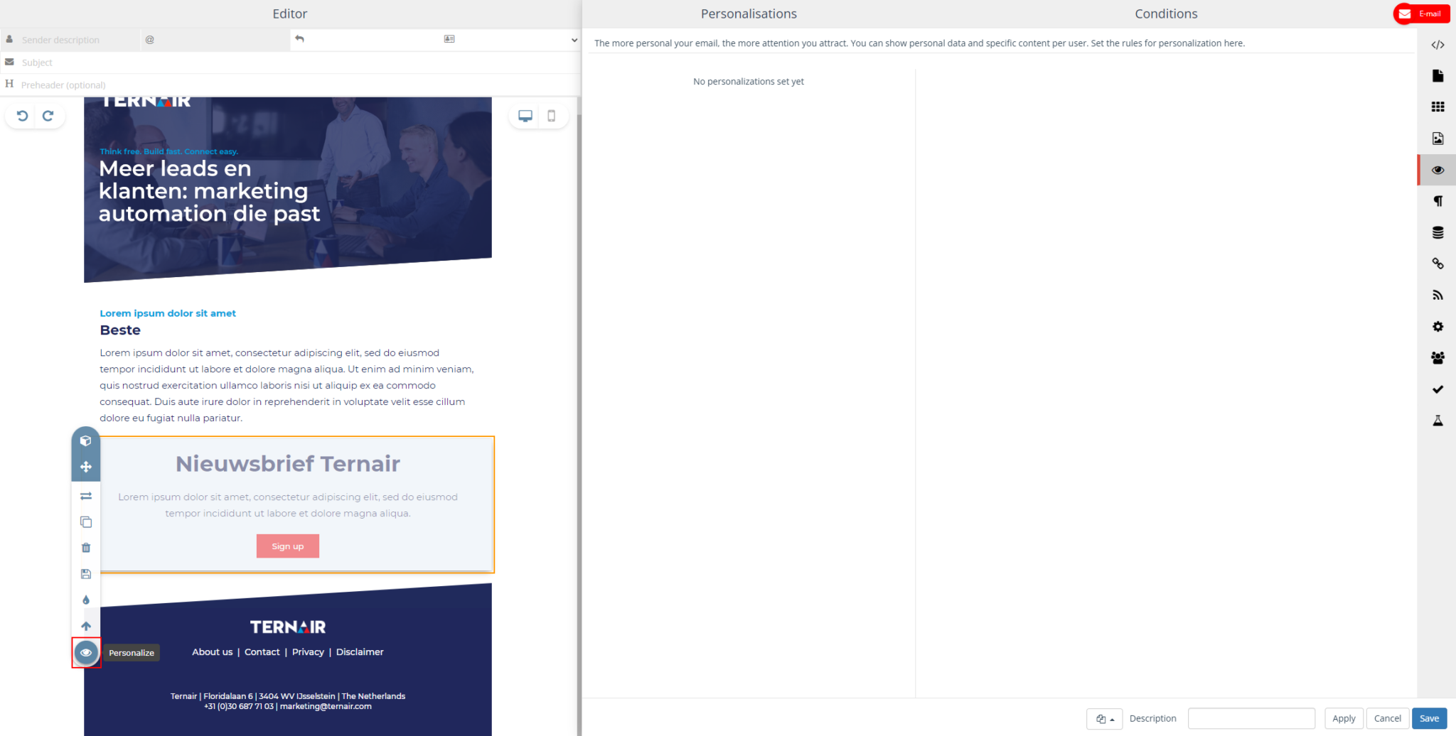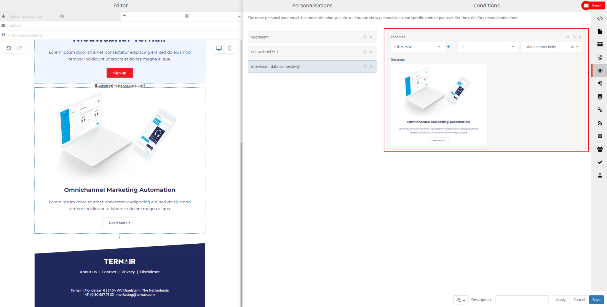In the email on the left you can see all the changes and options. And choose which content block belongs to which interest by dragging and dropping them into the email or adjusting texts.