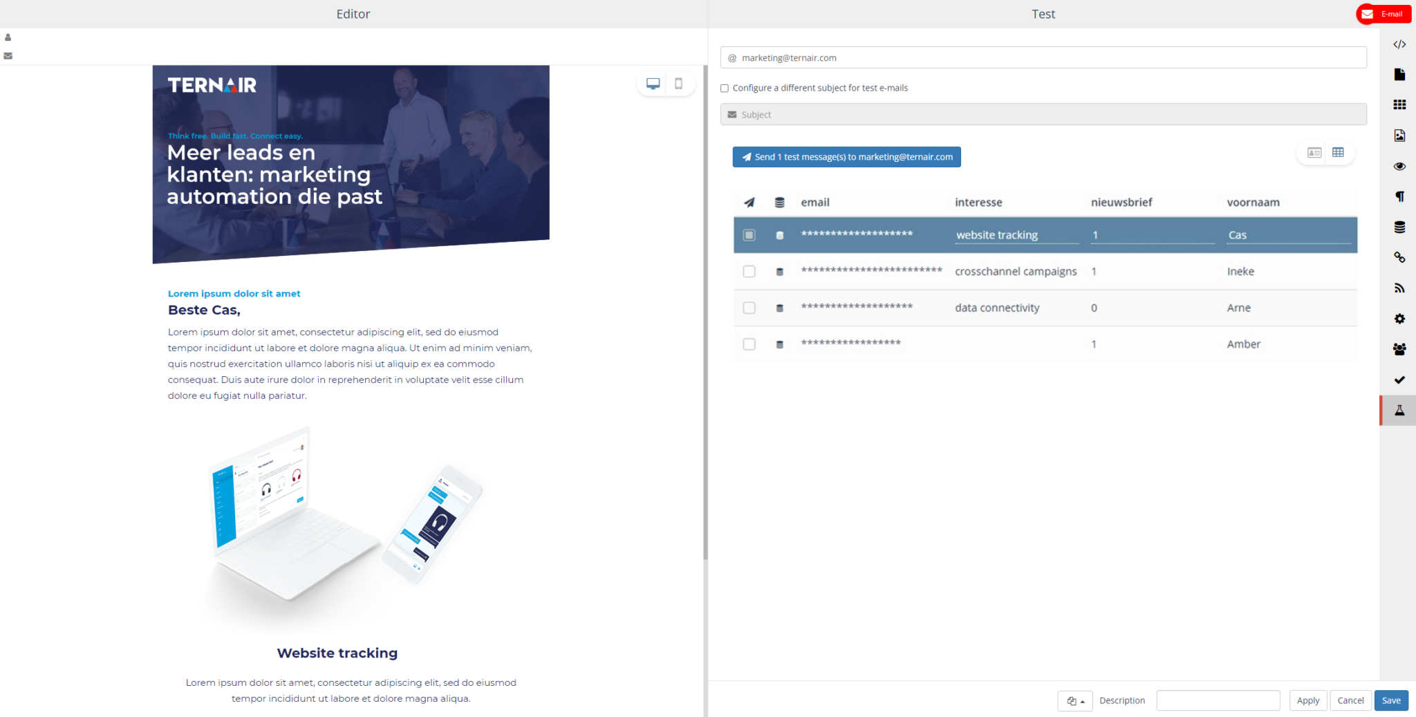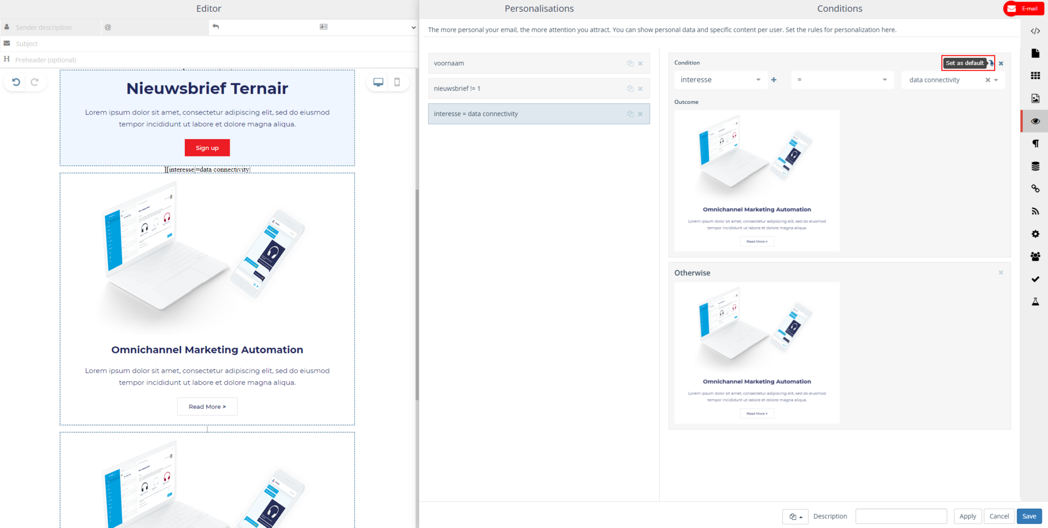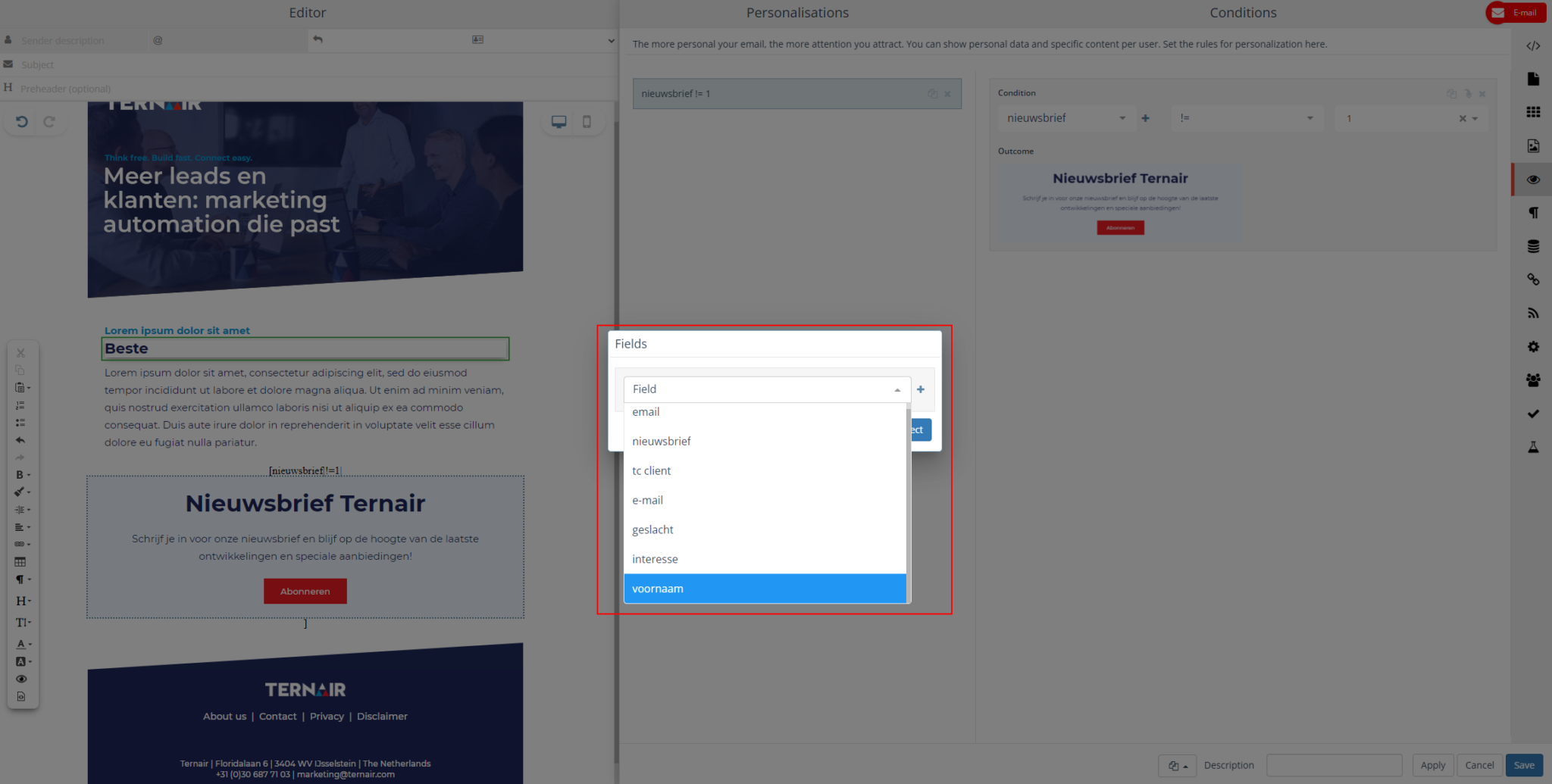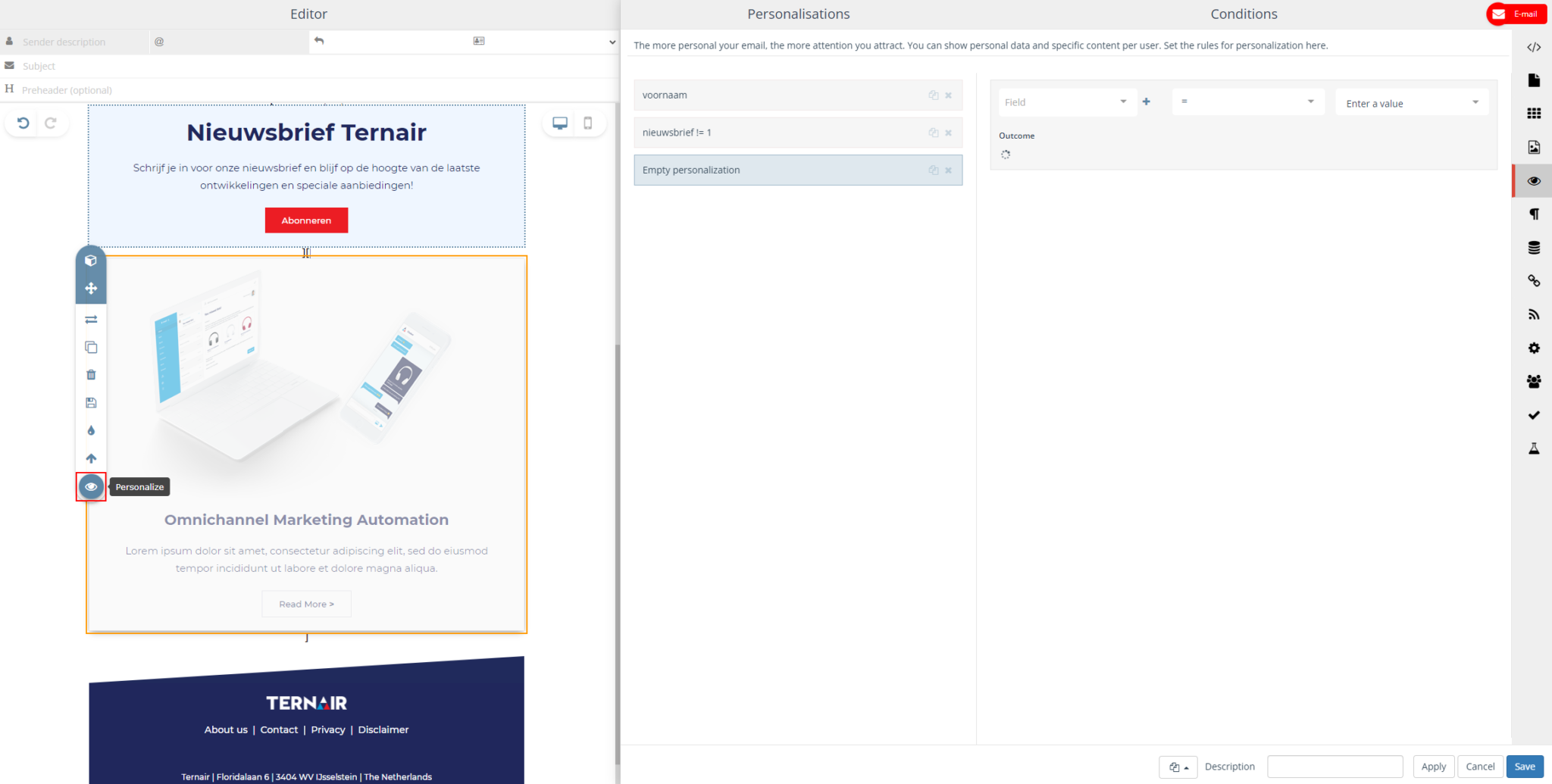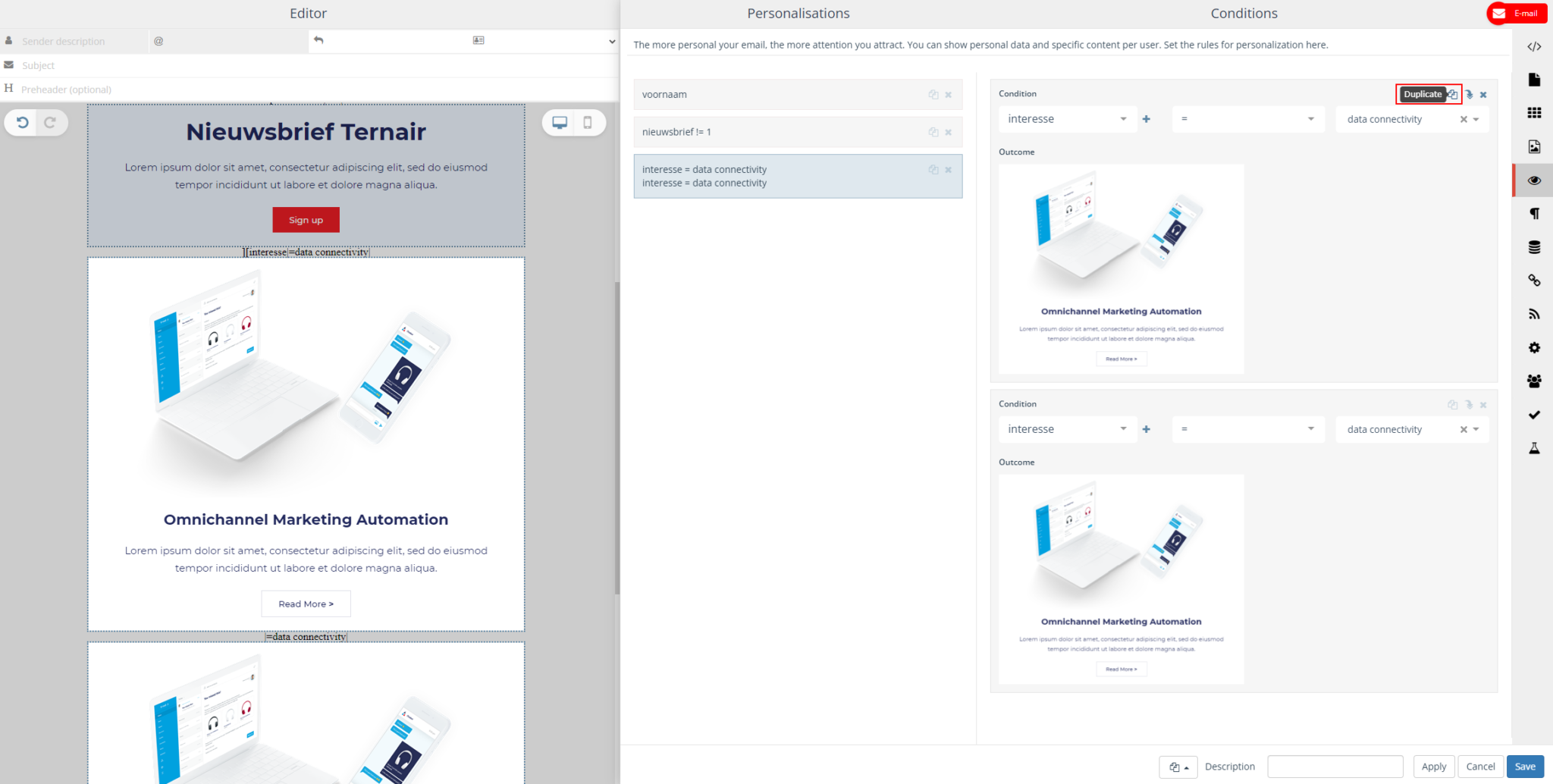 In the email on the left you can see all the changes and options. And choose which content block belongs to which interest by dragging and dropping them into the email or adjusting texts.