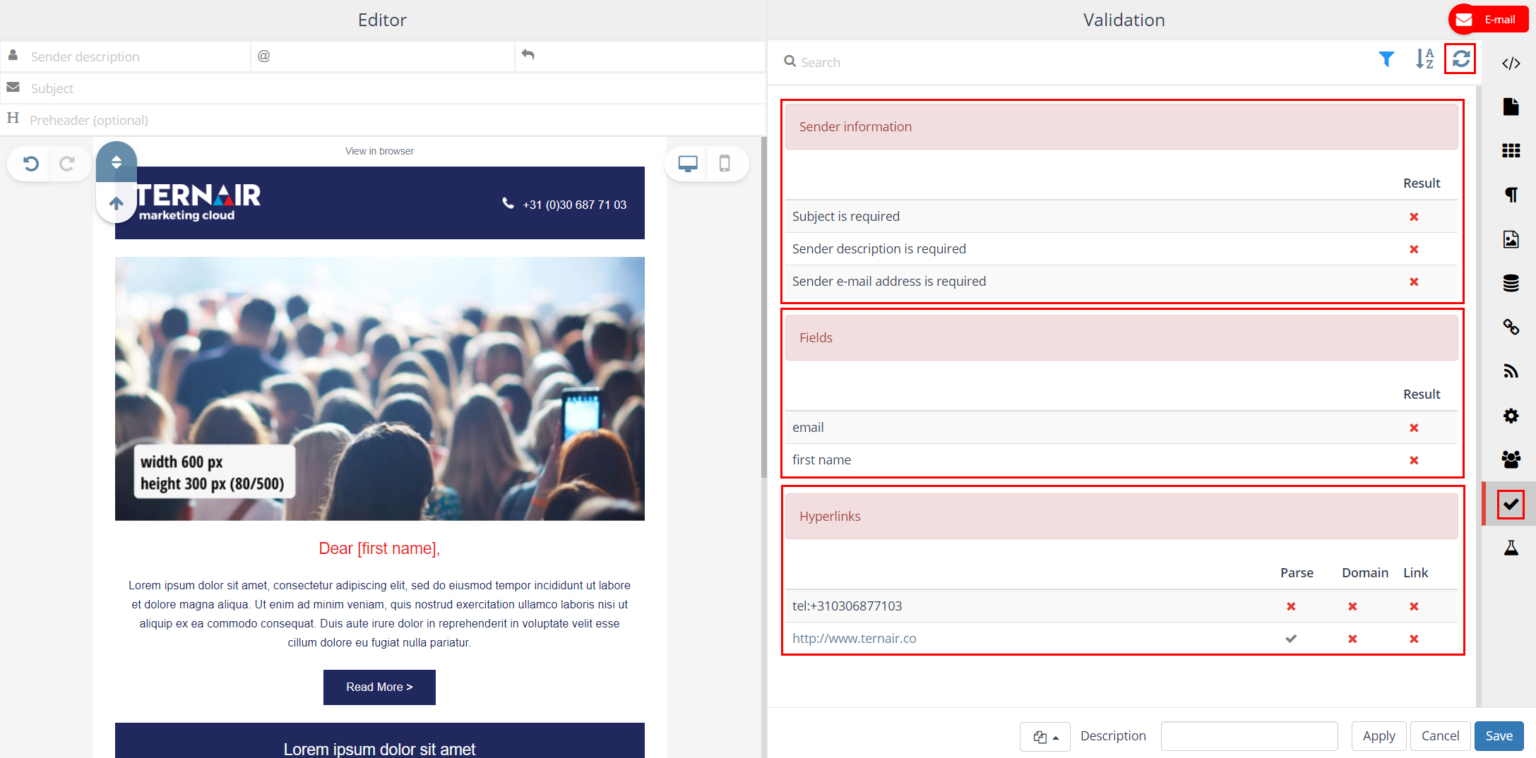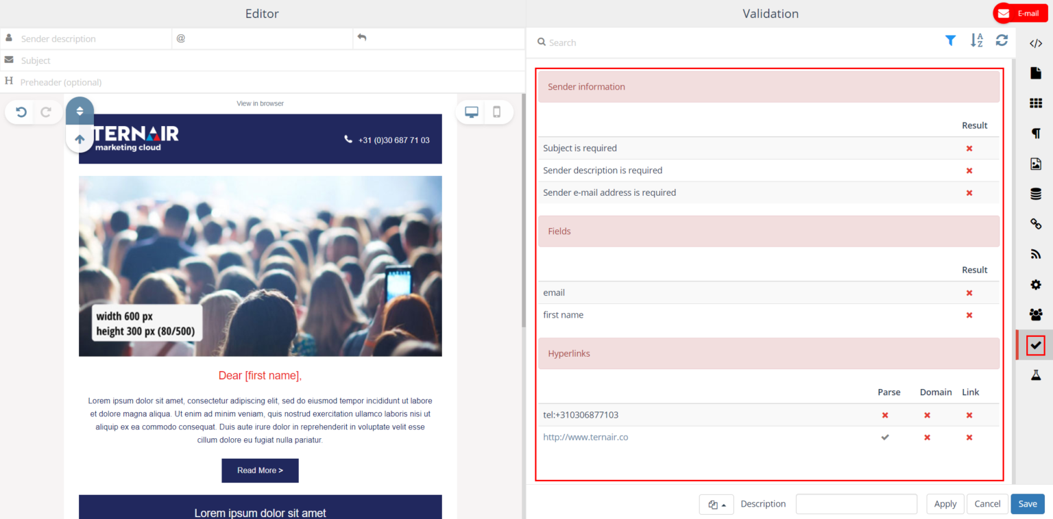 On the Validation tab, you can check your email content for errors.