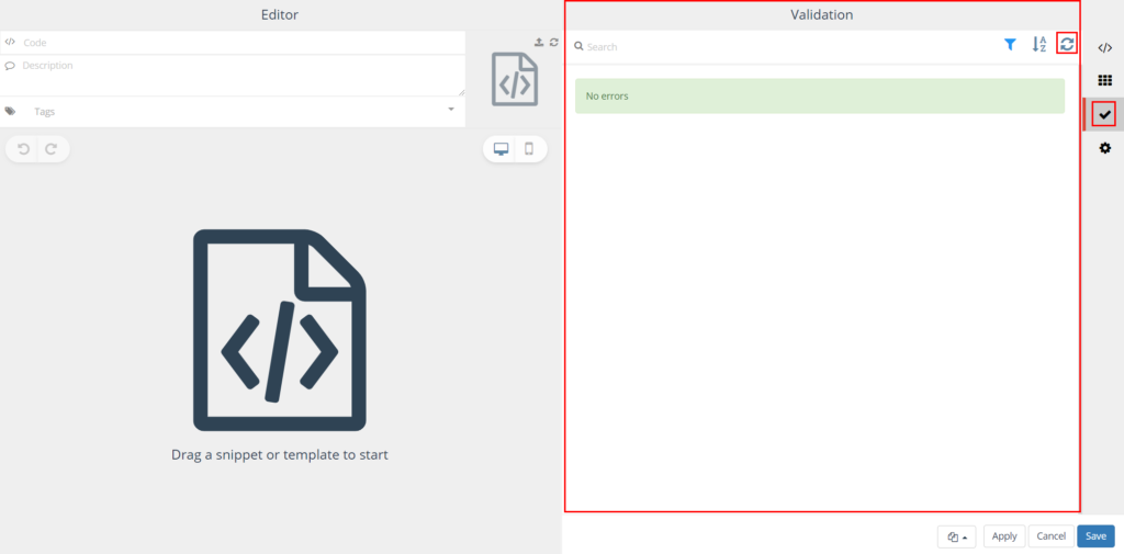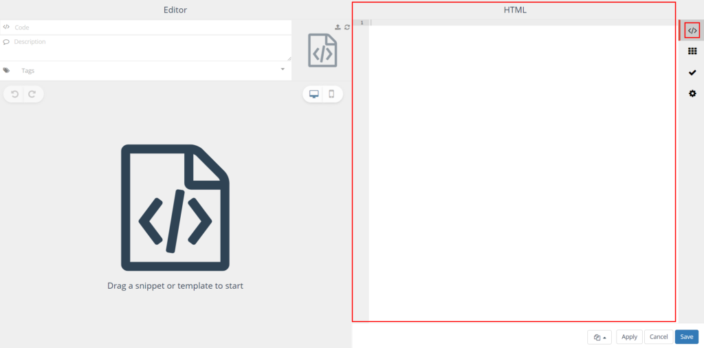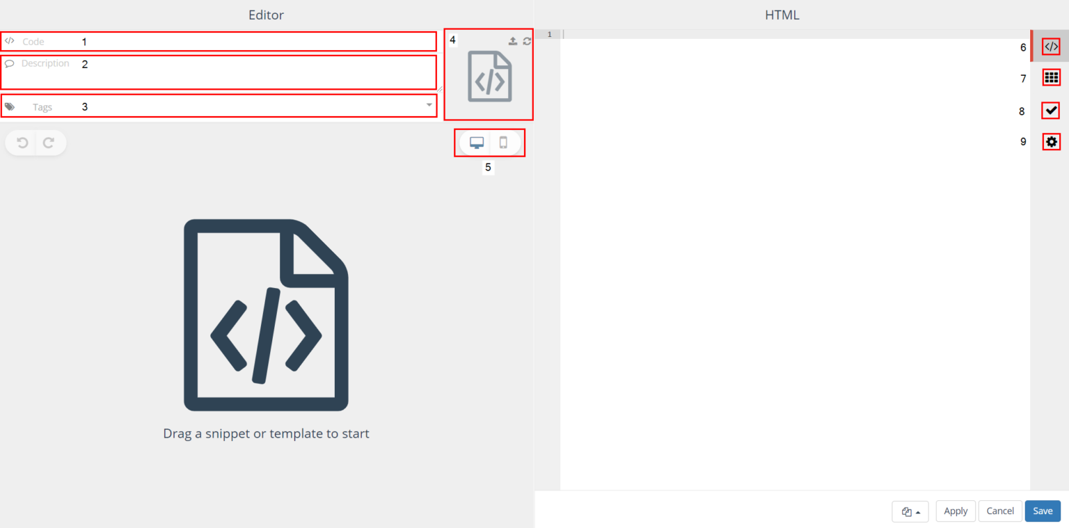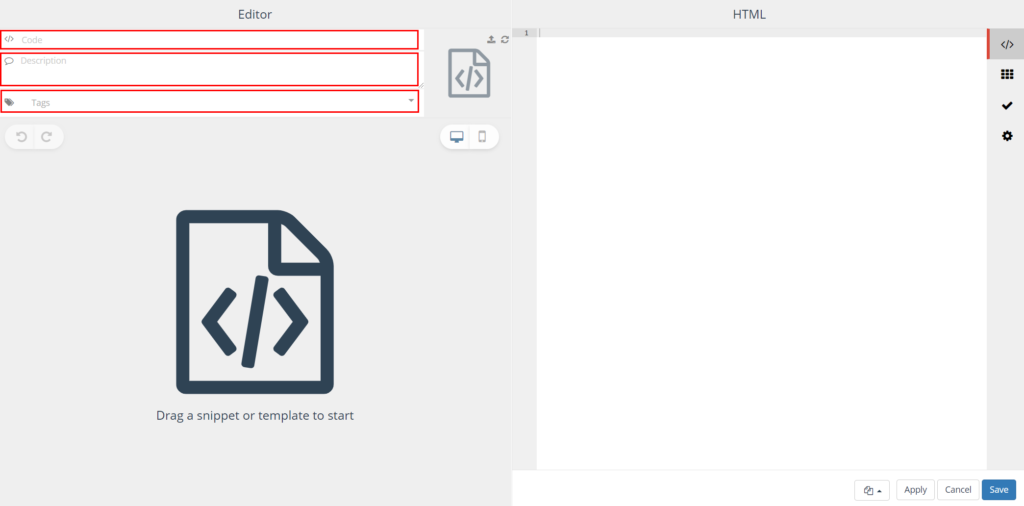 In a template, the code, description, tags and a thumbnail are displayed on the left side. On the right side you can find the settings.