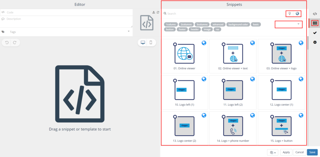Drag one or more snippets from the 'Snippets' tab to the left side of the block to build a landing page with snippets.