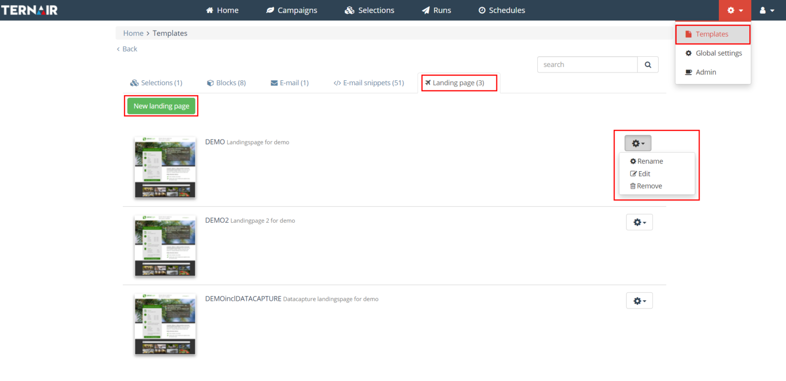 From the New Landing Page button on the Landing Page tab of the templates screen in Ternair Campaign, new landing pages can be added.