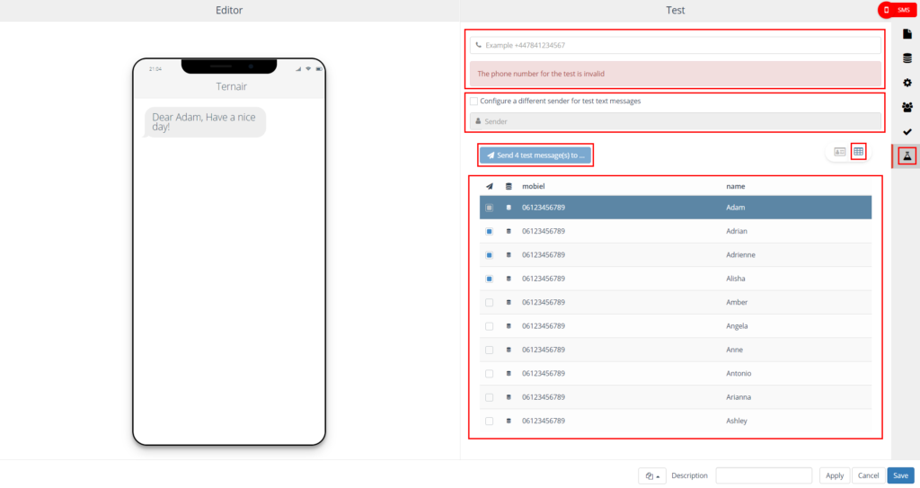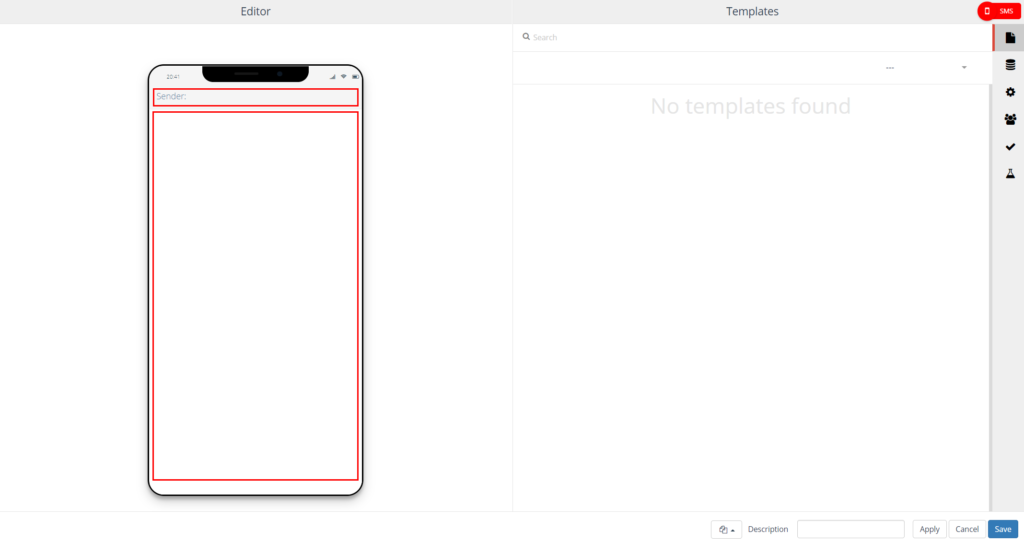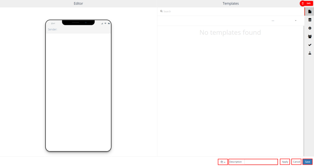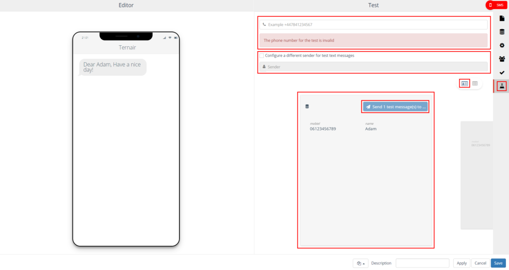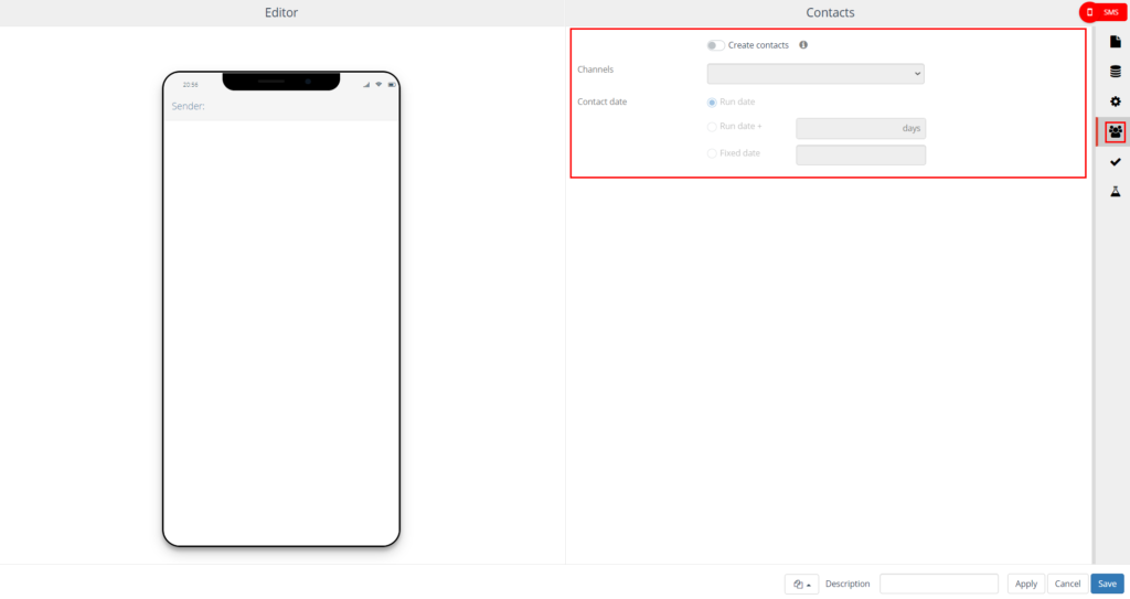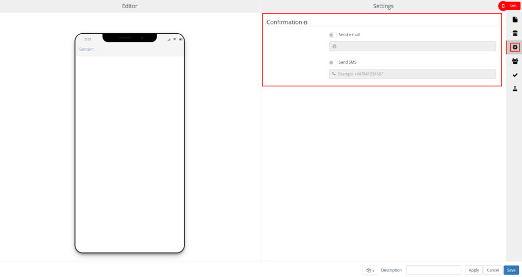 On the left side, the SMS editor is displayed. On the right side you will find the settings.