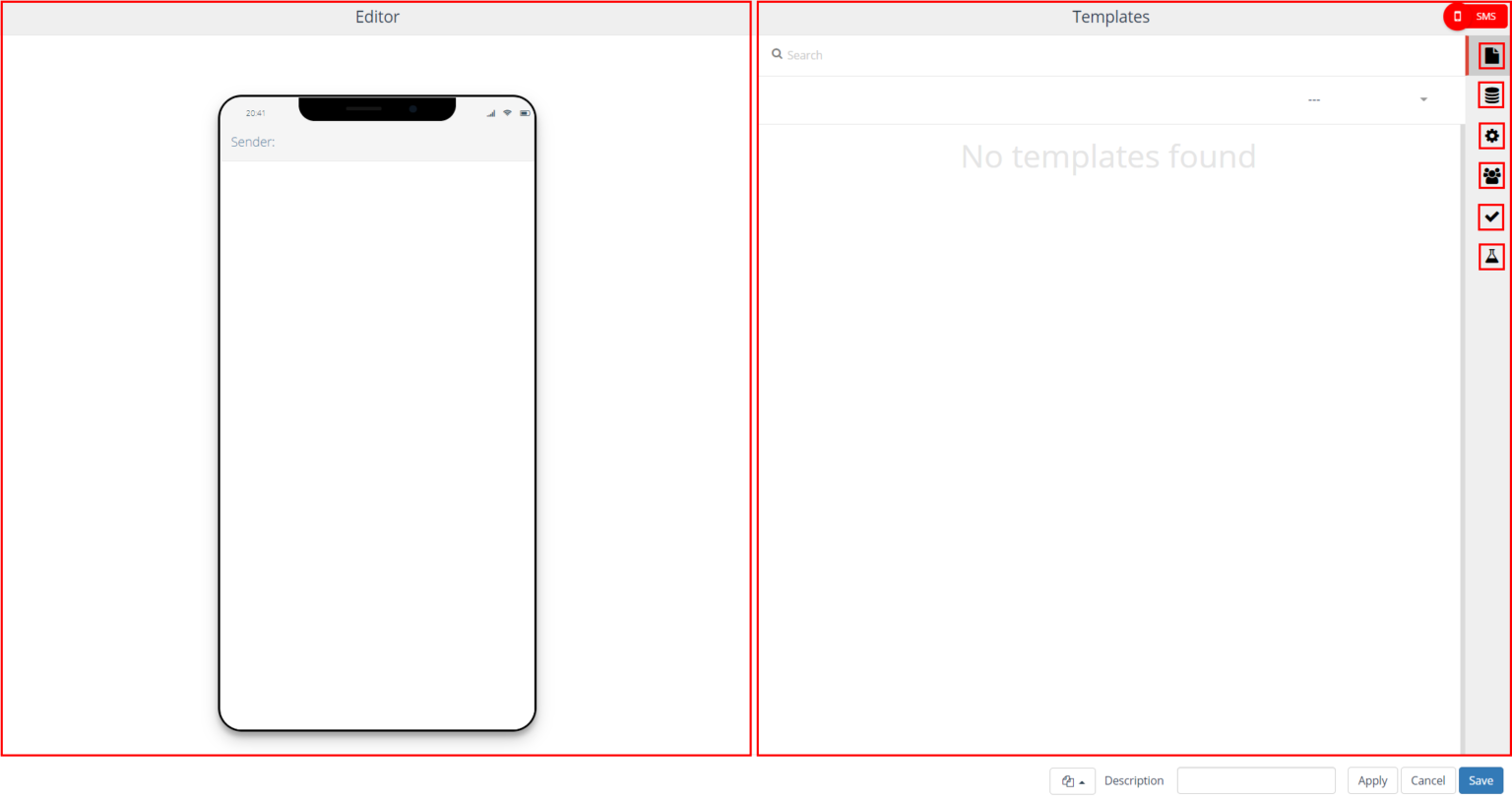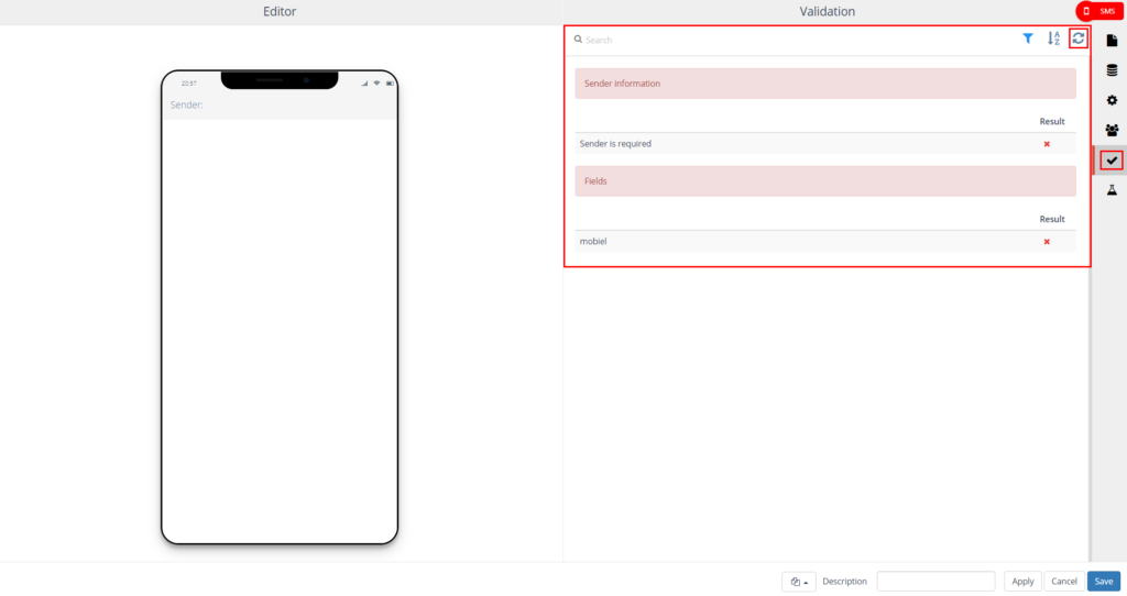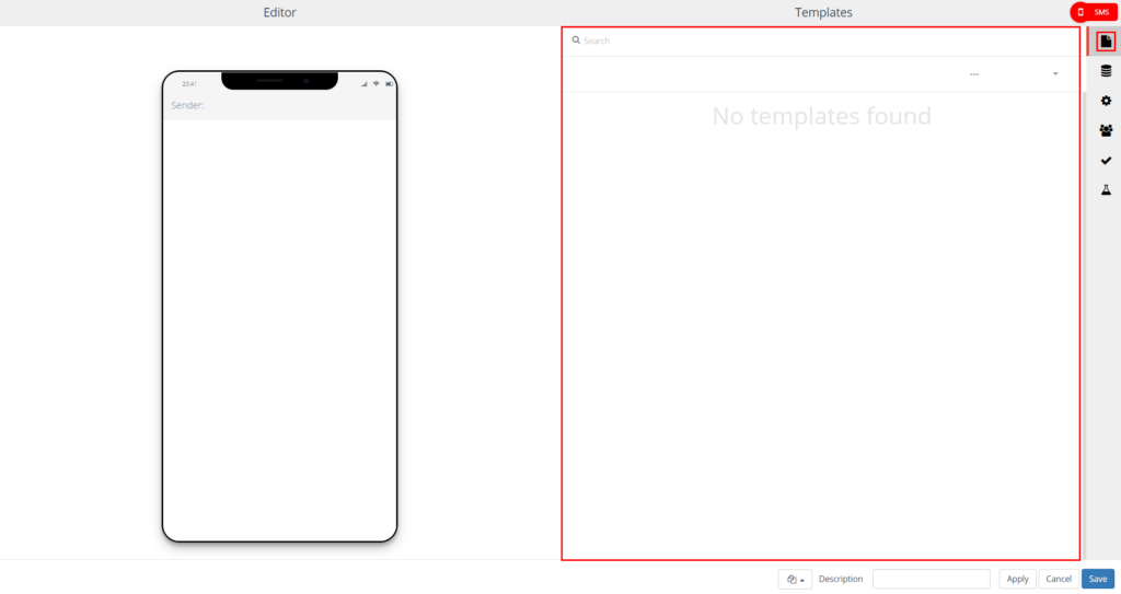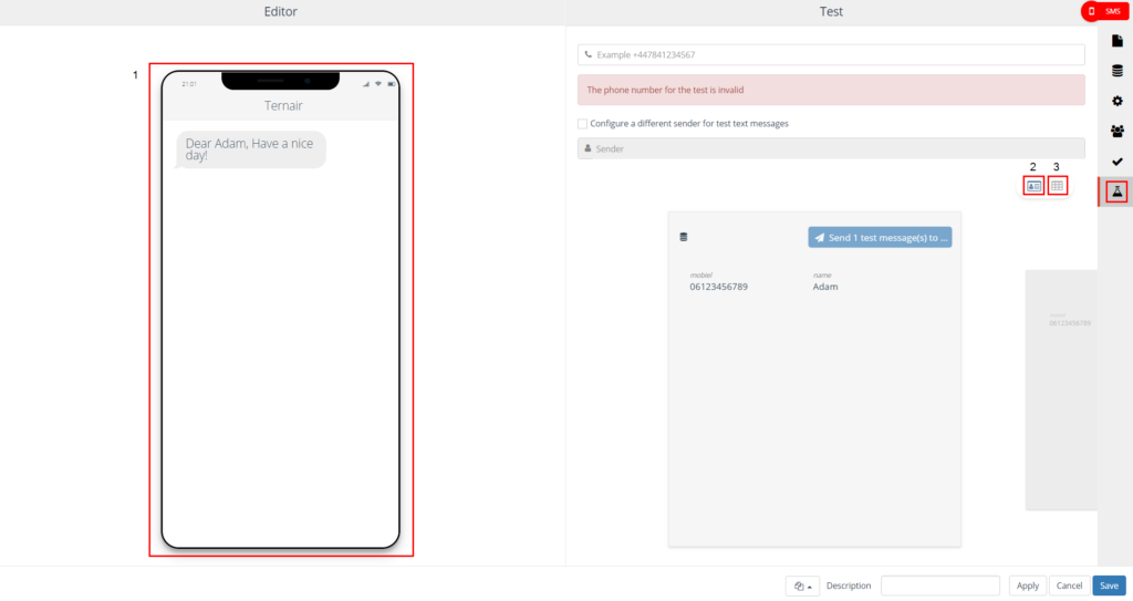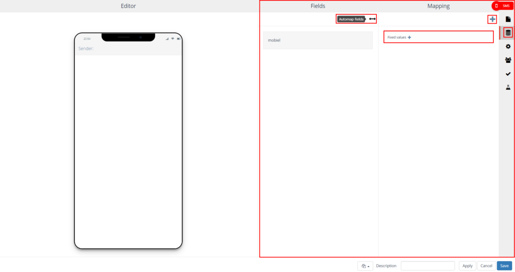 On the left side, the SMS editor is displayed. On the right side you will find the settings.