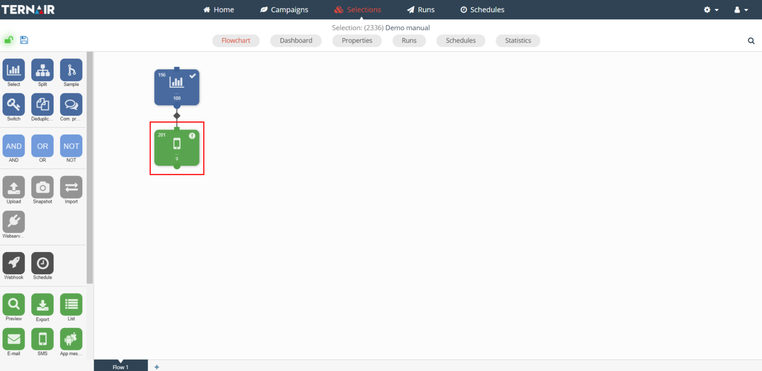 The output function 'SMS' can be used to set up an SMS mailing in Ternair Campaign.