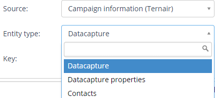 All collected default values are stored in the entity 'Datacapture' and all other values are stored in the entity 'Datacapture properties' under the source 'Campaign Information (Ternair)'.