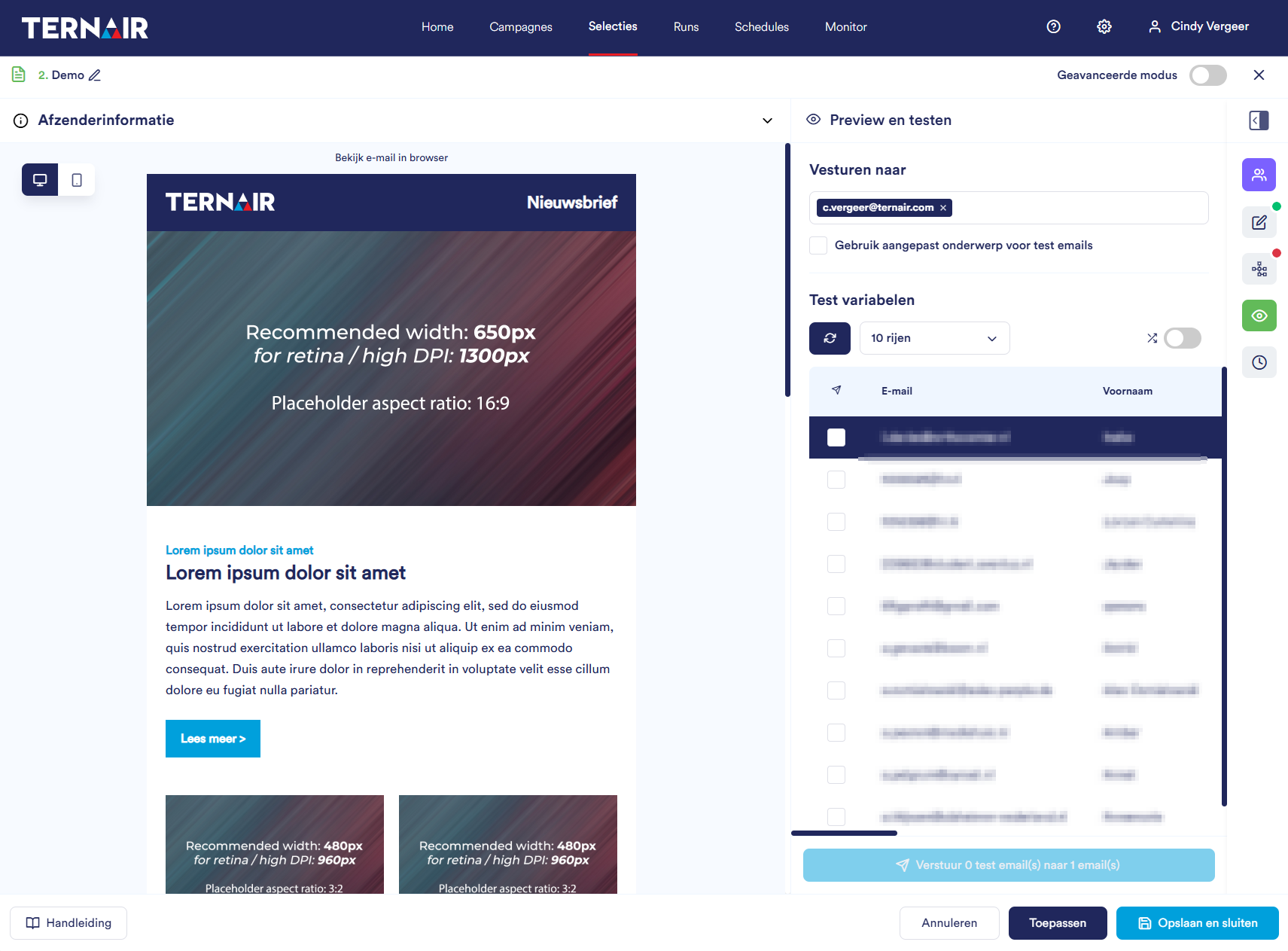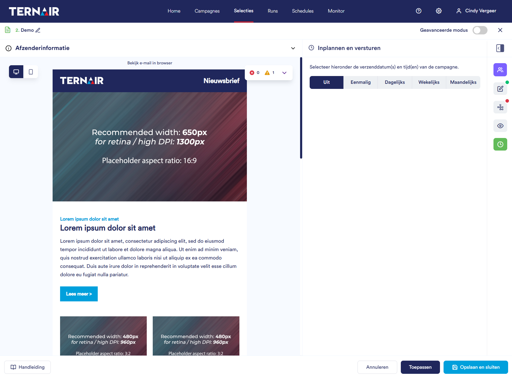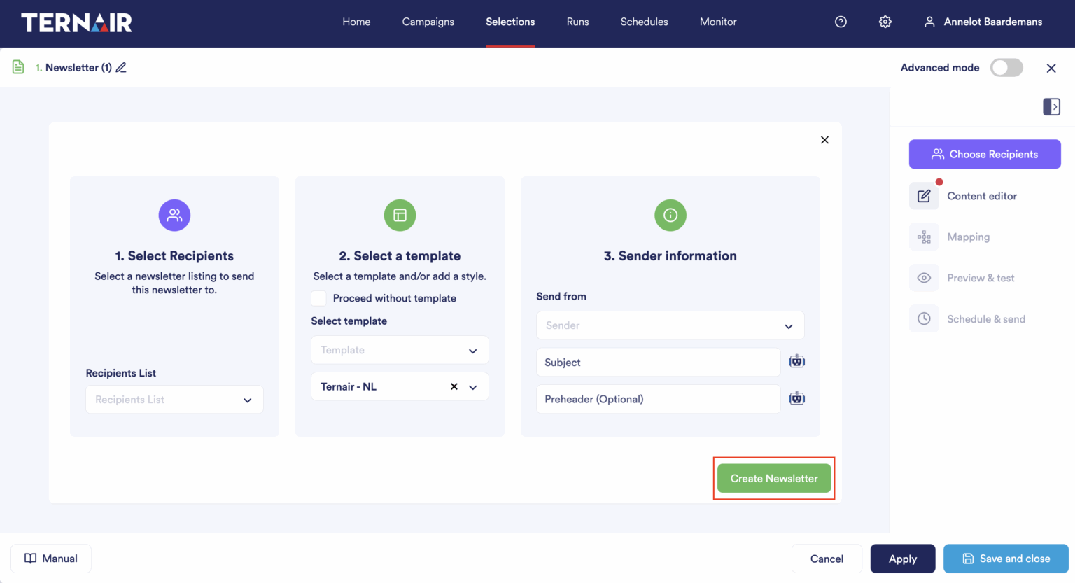 Under schedule and sending, the newsletter can be scheduled (periodically) and executed on the desired day and time.