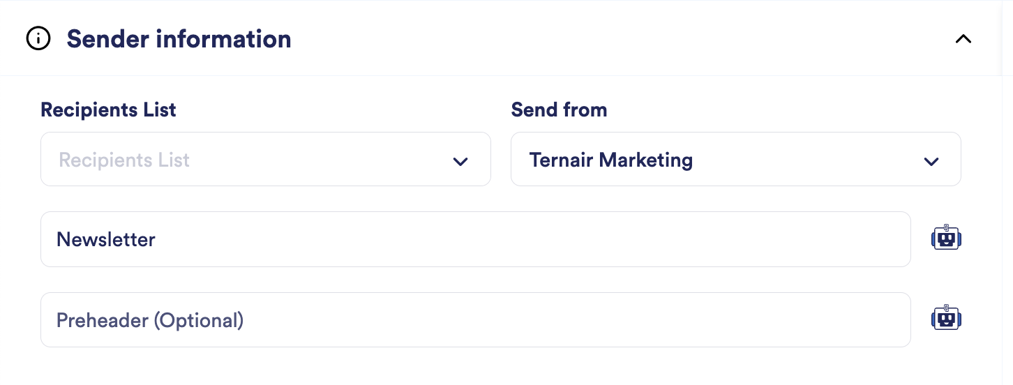 At sender you can select the sender of the newsletter. Below that you enter the subject of the newsletter and you can optionally add a preheader. You can have both the subject and the preheader generated by the AI assistant. You do this by clicking on the AI icon next to the subject or preheader.