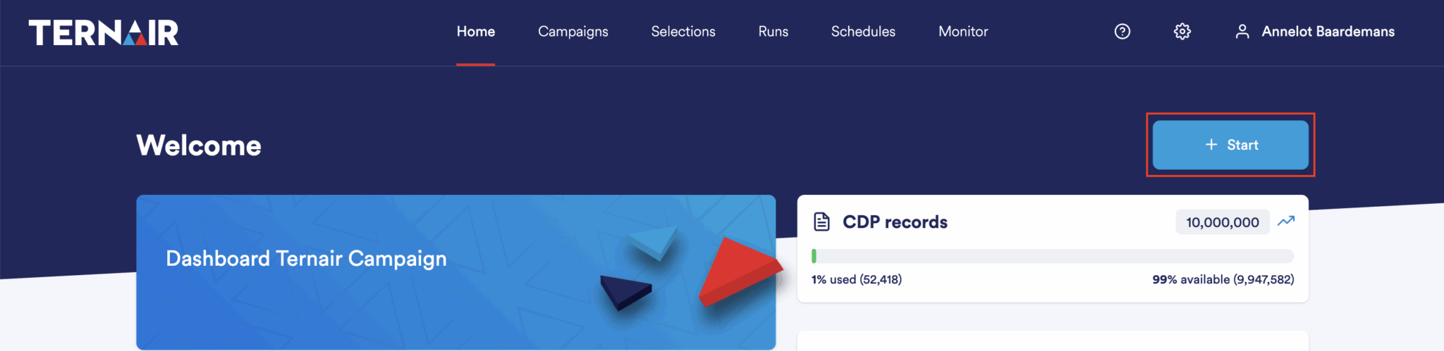 To send an email newsletter, on the home screen, click the '+ Start' button on the right.