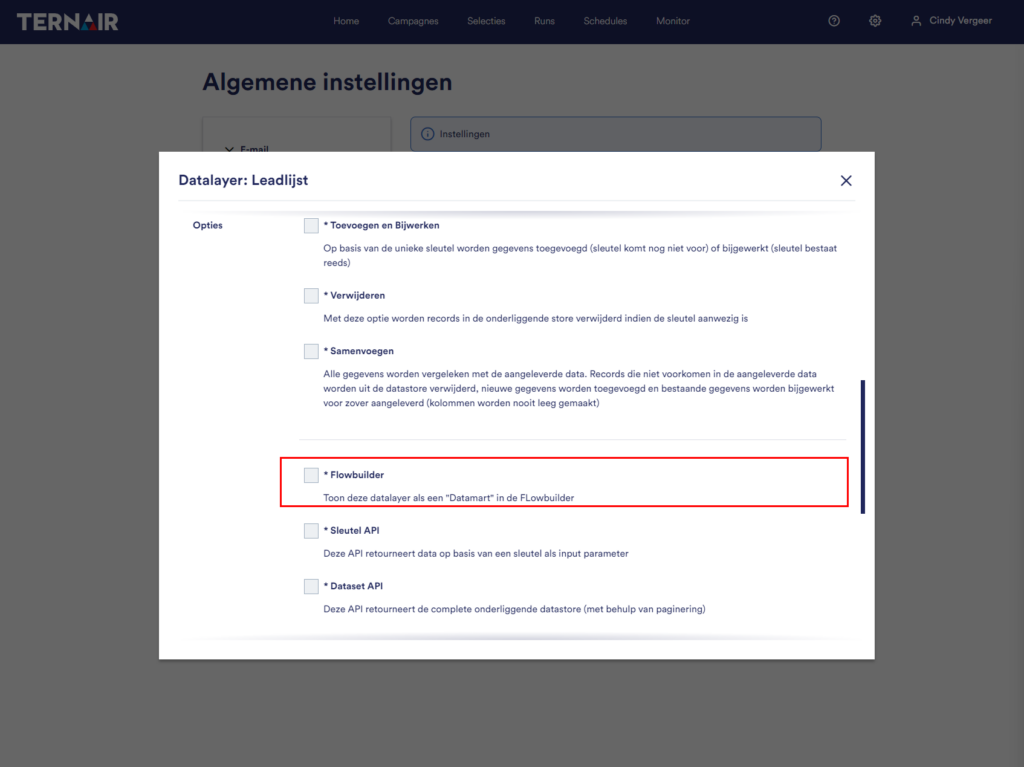 With the Flowbuilder option you specify whether the datamart is available in the flowbuilder.