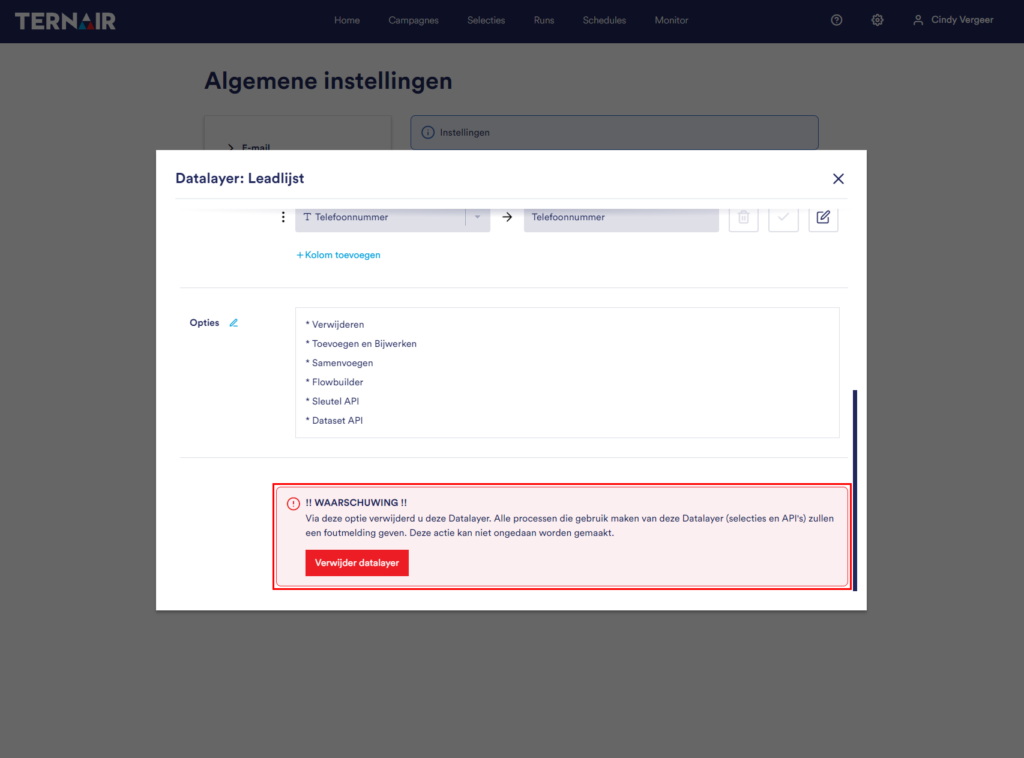 Please note: If you delete the datalayer, all processes that use this datalayer (selection and APIs) will return an error message. This action cannot be undone.