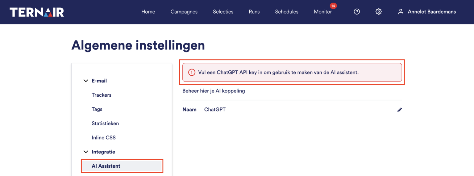 In the general settings you can define the AI assistant. If no API key has been added yet, you will see the error message below.