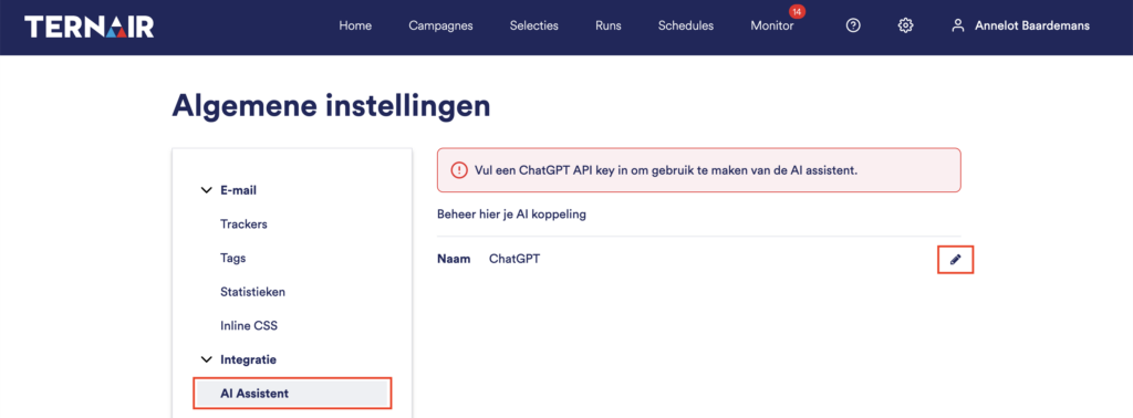 With the 'AI Assistant' you can have ChatGPT generate texts within the email editor of Ternair Campaign.