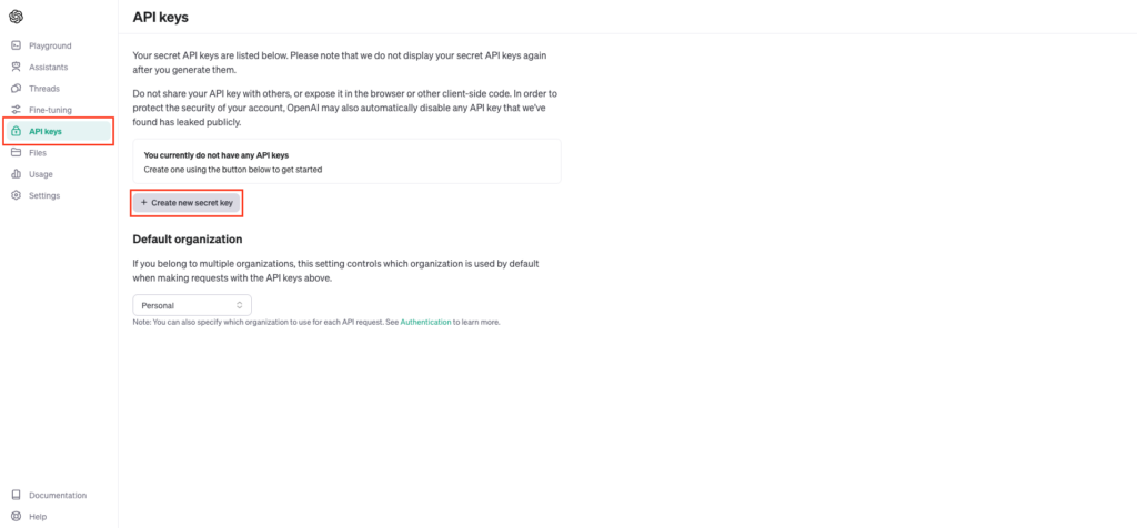 Click 'API keys' on the left side of the menu. Click on '+ Create new secret key' and create a new API key. Copy this code.