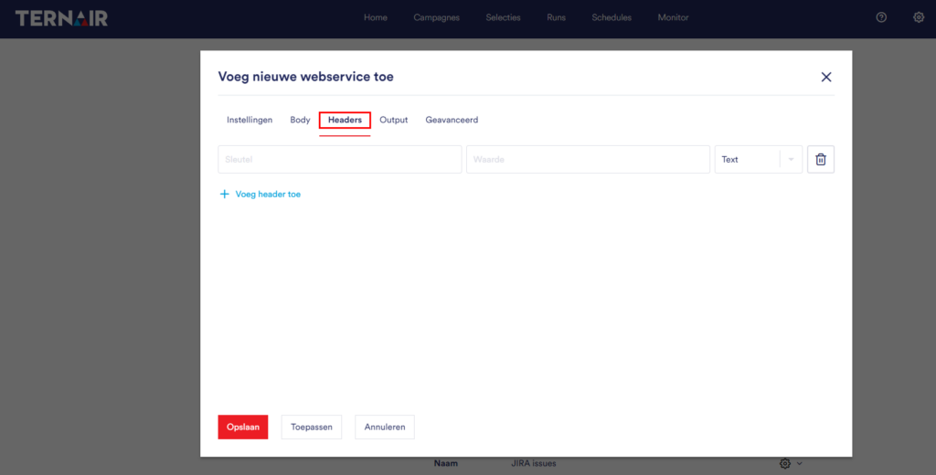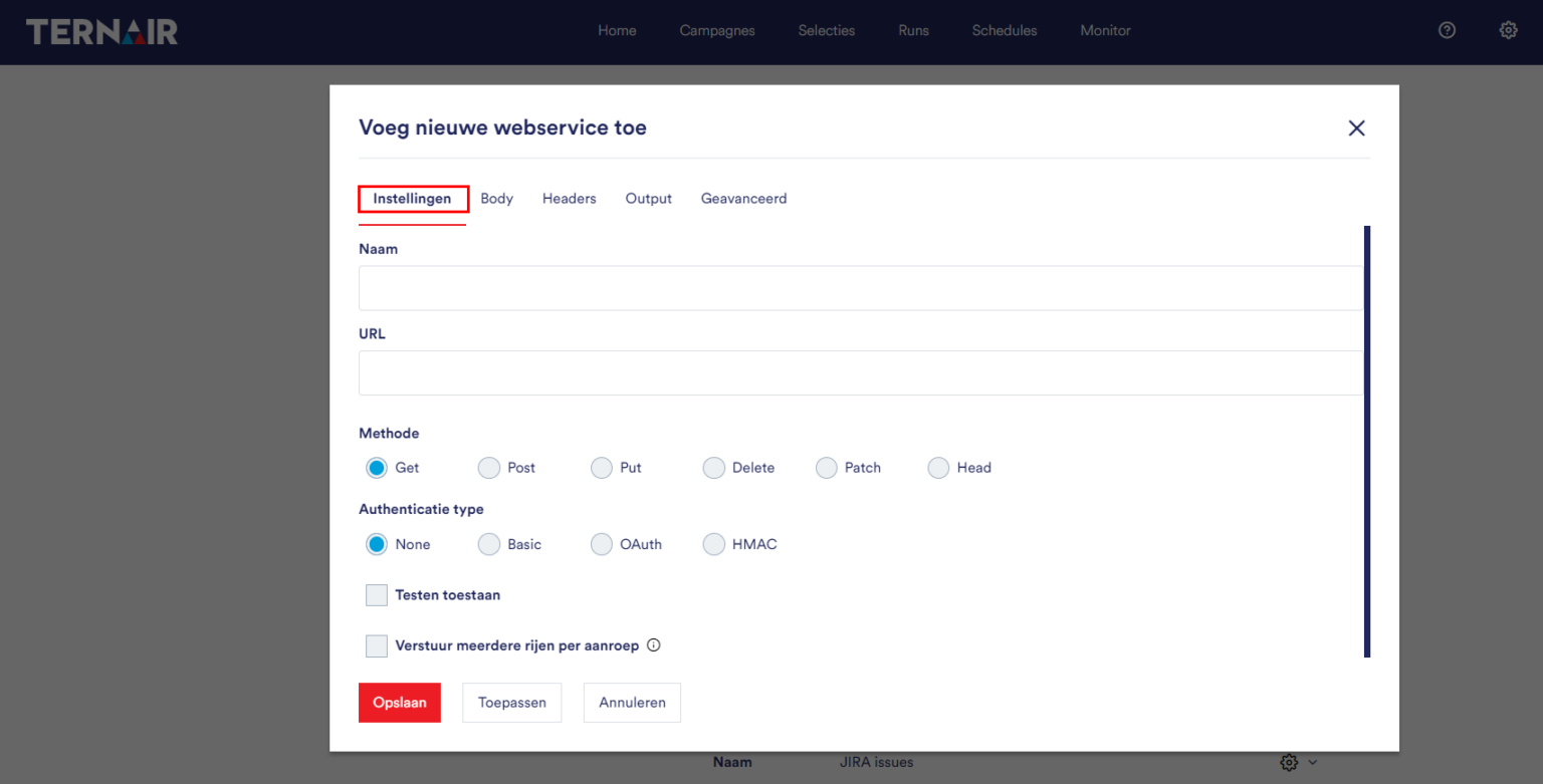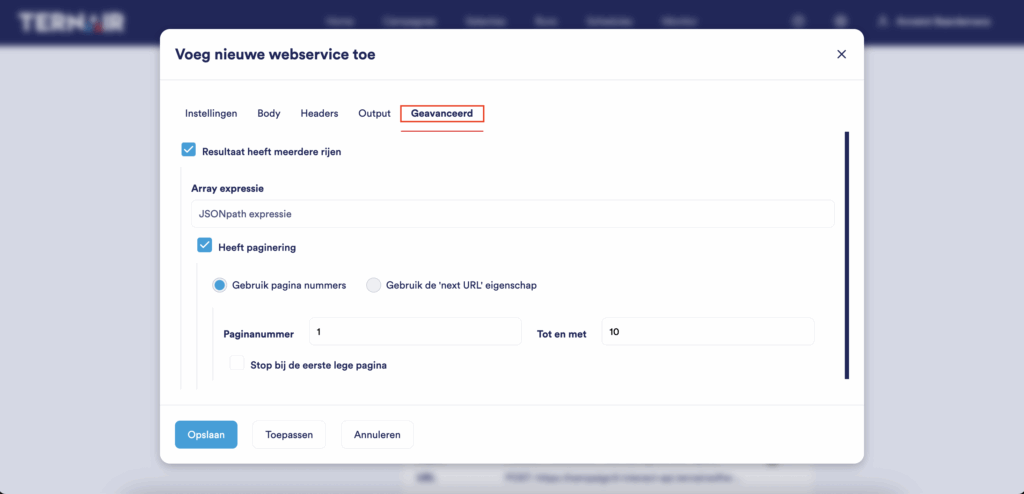 If the web service needs to return multiple "pages", you can use the "Has pagination" option. With page number you can specify which range of pages should be retrieved. By default, this is 25 pages. Contact your consultant if this number is not sufficient. Page numbers start from 0. Page numbers can be used in the url or the supplied body by mapping them {{pagenumber}}. If you check the 'Stop at first blank page' option, pagination is stopped at the first blank page.