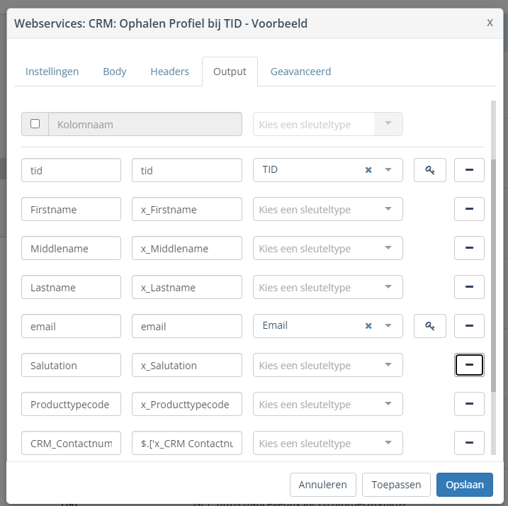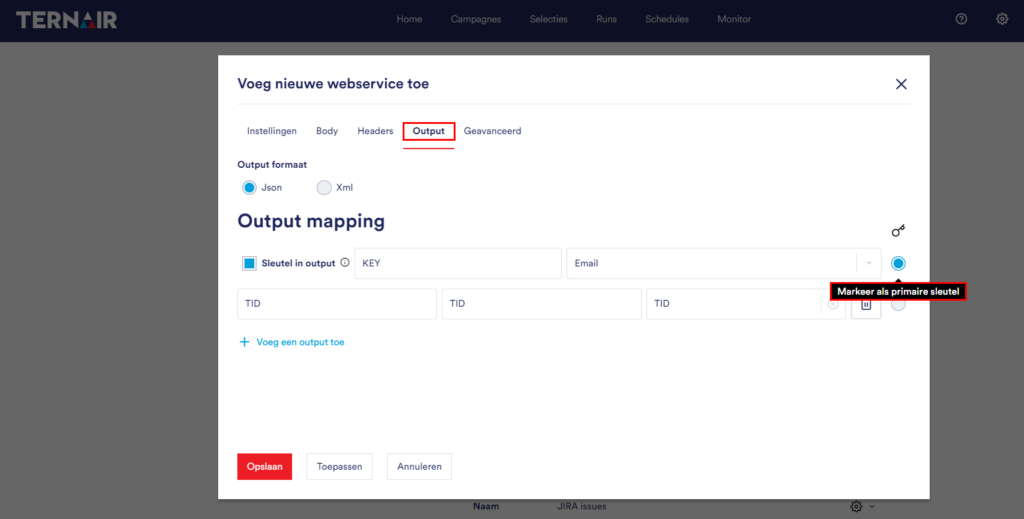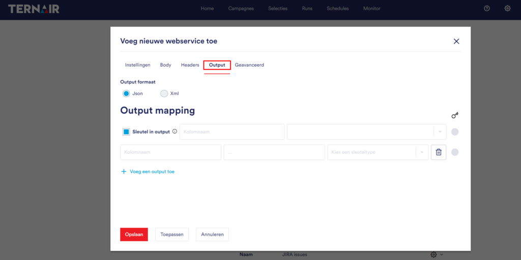 The settings in the output tab allow you to choose which fields will be retrieved for selection and output in campaign.