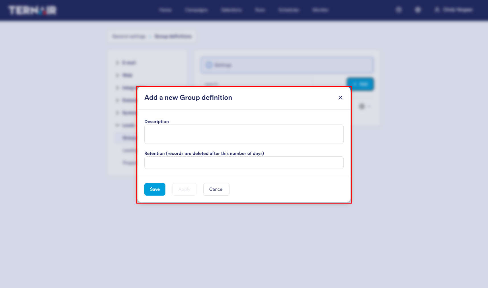 Fill in the Retention the retention period, by entering the number of days after which the record will be automatically deleted. For example: for a retention of 14 days, the record will be automatically deleted after 14 days.