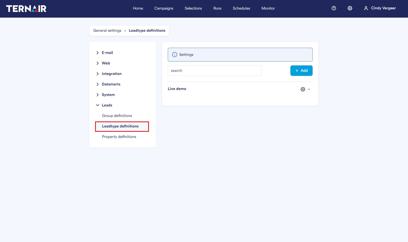 In the general settings for Leads, you can view, create, edit and delete Group Definitions, Lead Type Definitions and Feature Definitions.